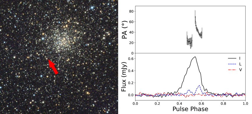 右:来自“中国天眼”观测数据的M71E的平均脉冲轮廓和偏振位置角。(中科院国家天文台供图)
