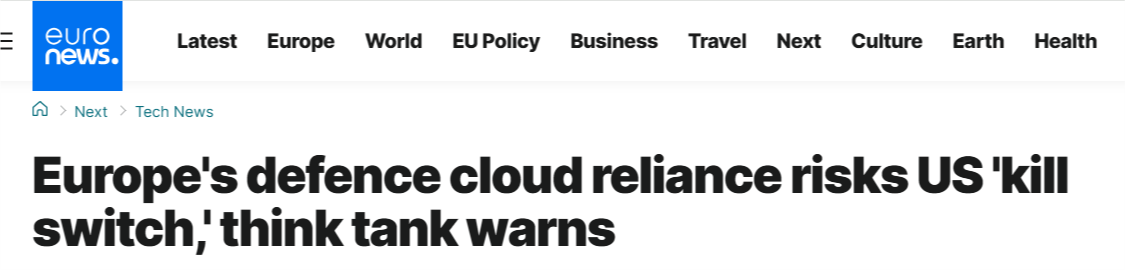 欧洲新闻台16日报道称,总部位于布鲁塞尔的智库——技术前景研究所(FOTI)的一项最新分析发现,绝大多数欧洲国家依赖美国云服务来支持其国防机构,这使它们面临随时被“切断开关”的风险。