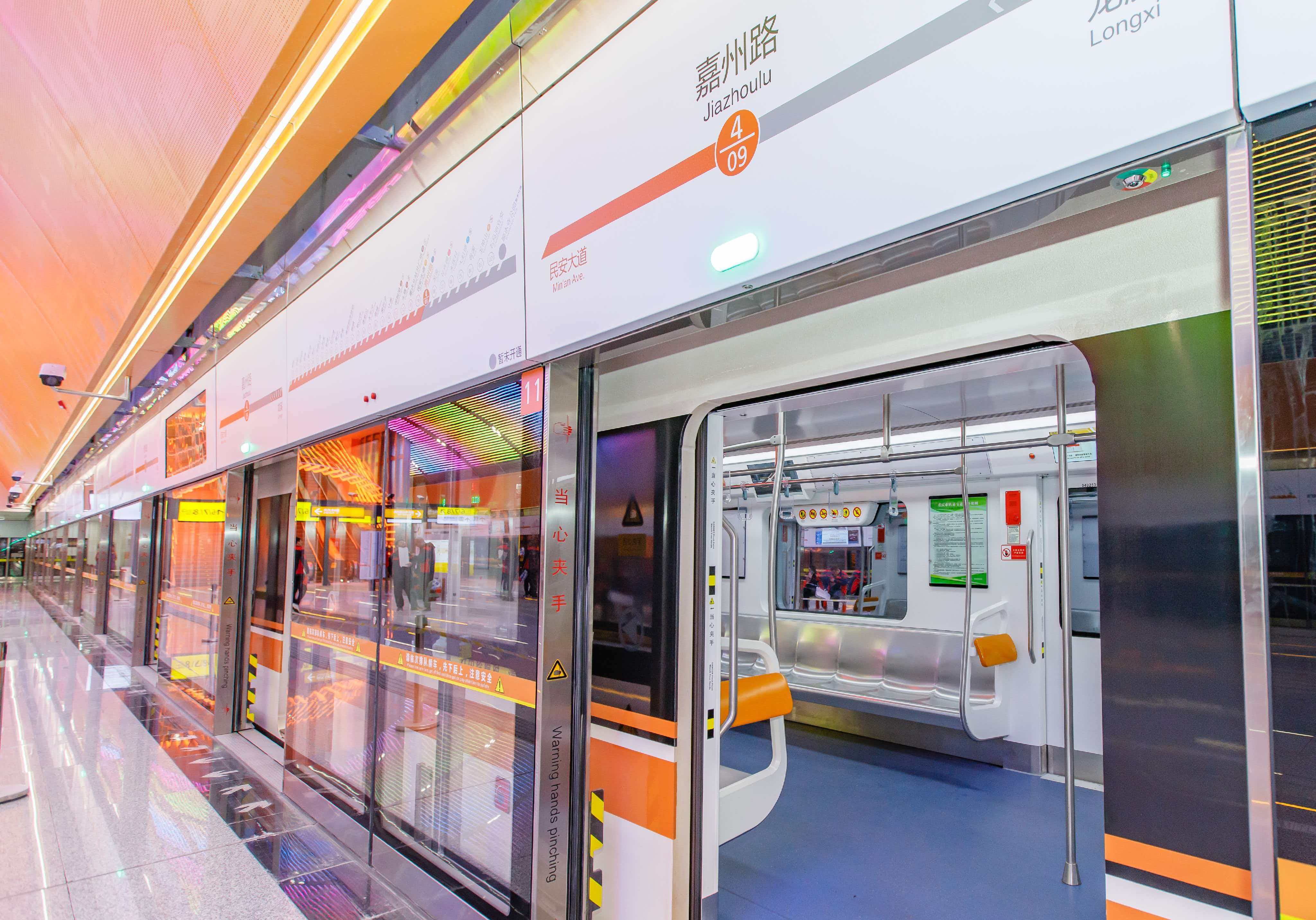 走进4号线西延伸段,全线站点延续4号线一期的装修风格,凸显线域文化。最具特色的嘉州路站,针对新牌坊片区用地紧张的情况,创新采用分离式端头厅设计方案,成为国内首座深埋暗挖分离式端头厅车站,这一设计使层高超7米的站台层空间无立柱,视觉更加宽敞,展现出站城融合、空间通透与绿色建造等特点。其以橙色为主色调的站台搭配炫酷的灯光设计,高超的颜值将氛围感拉满,人行其中犹如穿梭于时光隧道。