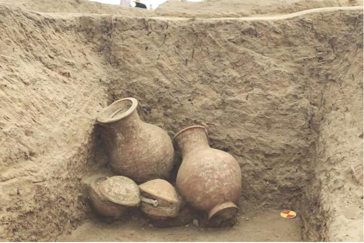 在距开口0.9米深时,队员们发现有陶罐存在,清理方式类似清理人骨,由北向南缓慢清理。清理过程中,发现南部两具人骨,人骨较陶罐在更深处。最终整体揭露出两具人骨,位于墓葬偏南部东、西两侧各一具;3个完整陶器,陶器上有红色纹饰,具有本土特色,位于墓葬西北部。后在找边时,发现墓西北部和东北部有两个小坑被M181打破,其中西北部的坑里存在鱼骨若干,经拍照后收集,东北部则没有遗迹现象,推测可能为盗洞。两具人骨在墓南部东、西各一具,其中西部人骨保存完整,东部人骨散乱分布。推测可能有盗扰情况,也有可能东部人骨是迁葬而导致的散乱分布。这个墓的发现和其他单人葬不一样,以往都是在书上见过的东西,现在原原本本地呈现在队员们眼前,还是自己亲手发掘的,大家的成就感不言而喻。