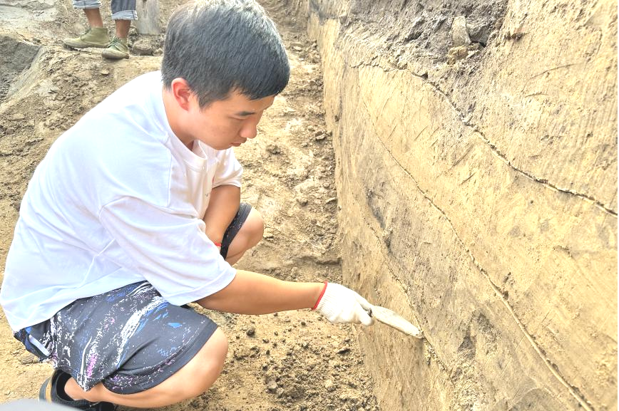 “只有亲身参与到发掘的每一处细节中,才能牢记这些步骤。”两个探方的发掘帮助队员们对田野考古流程形成初步认识。从选址布方、探铲勘测,到清理表土、刮面、初步判断遗迹现象后画线痕,再到由晚及早逐个发掘、清理和收集陶片、土样,最后写日记记录、绘图,整理资料,这一系列操作引领大家跨入田野考古的大门。