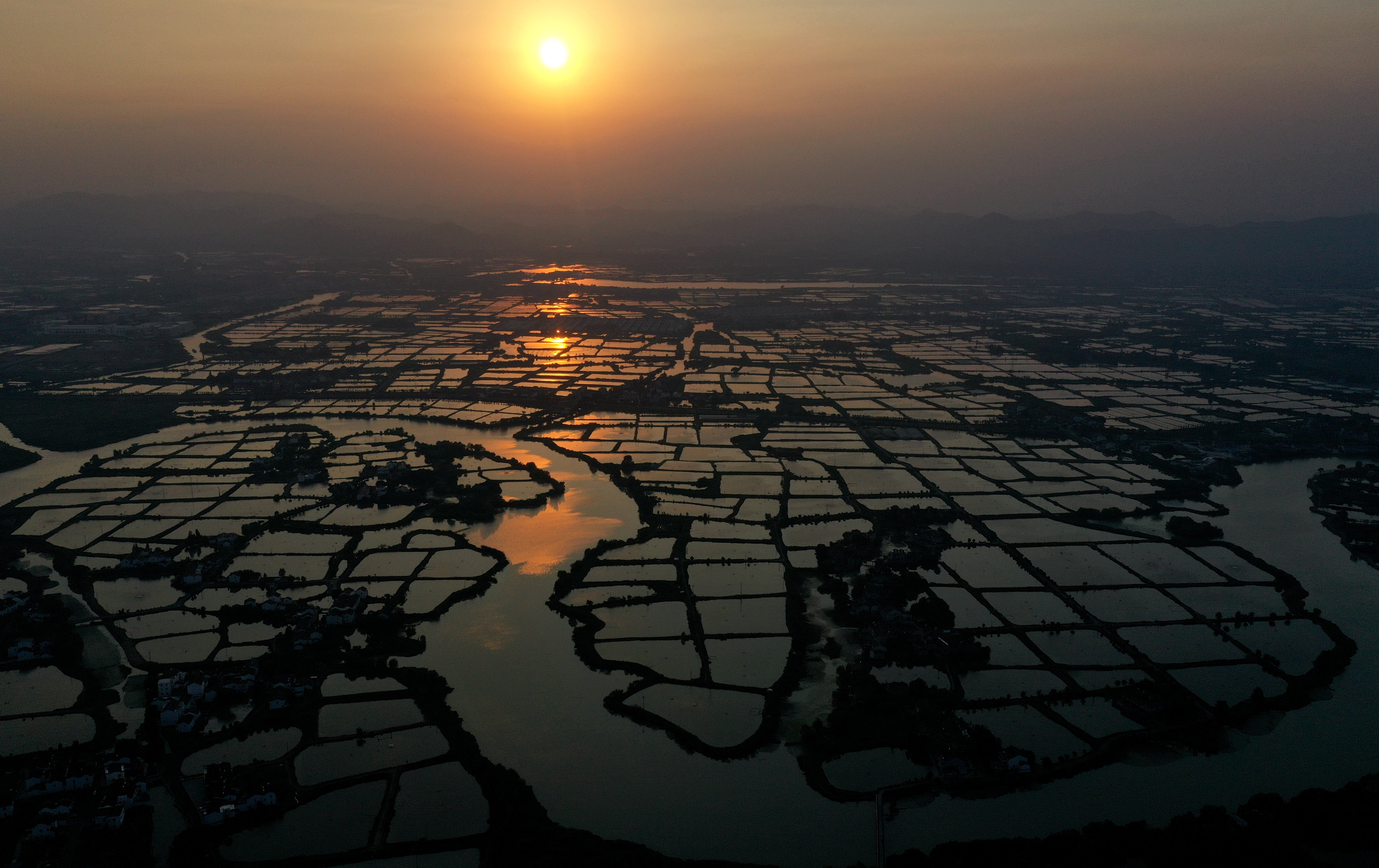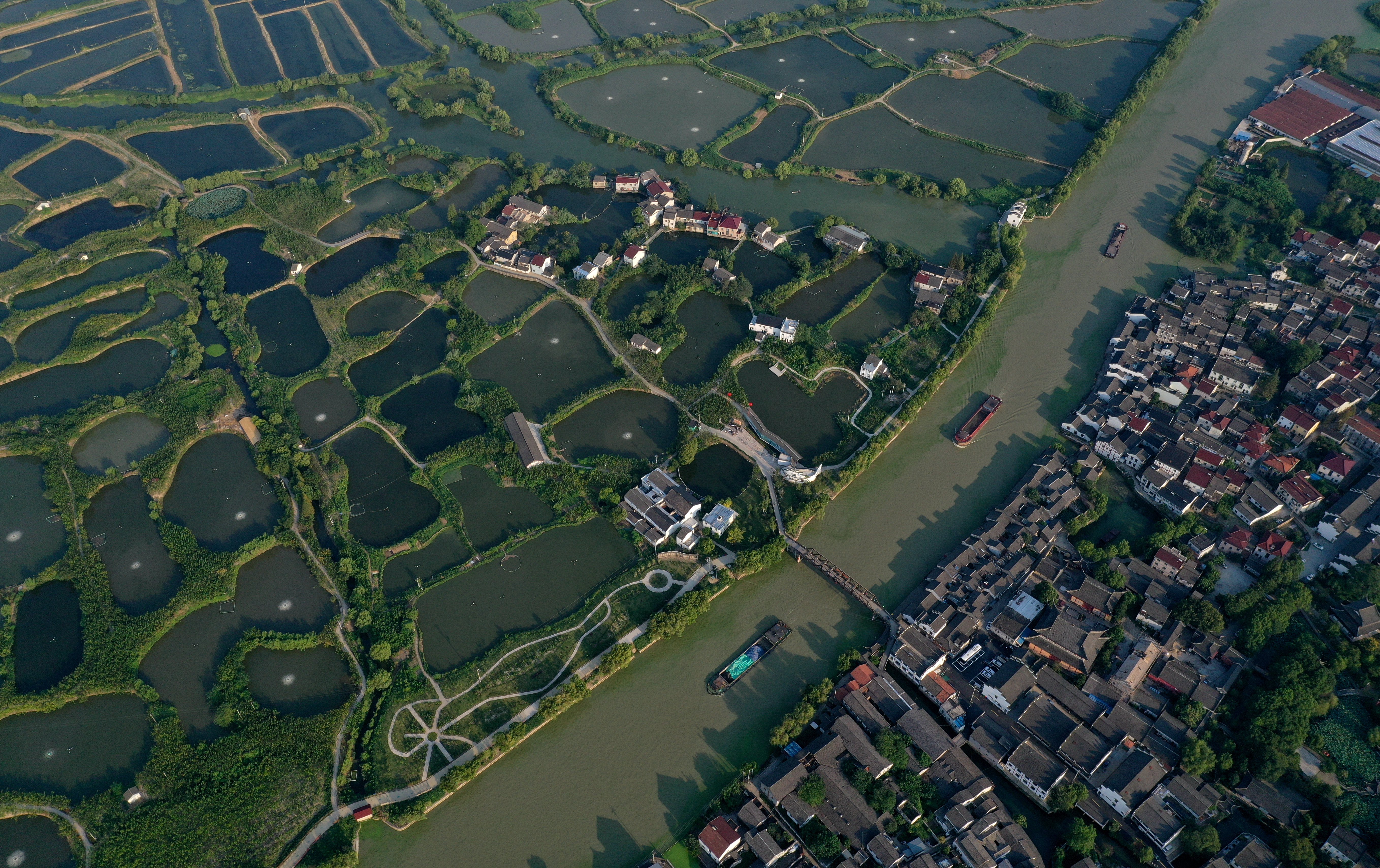 2019年9月17日航拍的湖州荻港村成片的桑基鱼塘。古老的桑基鱼塘系统与千年运河生生不息。