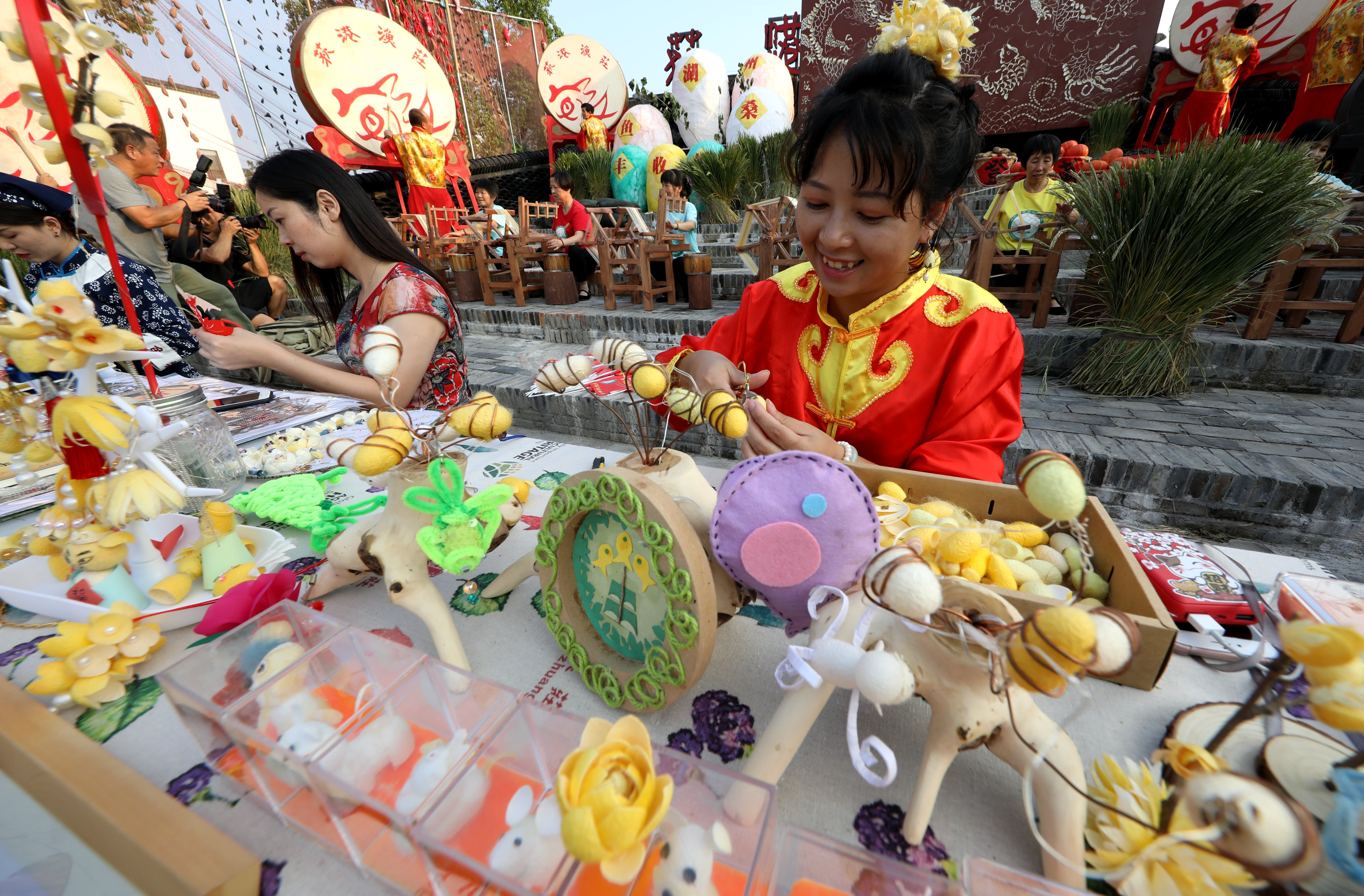 这是当地村民利用蚕茧制作各种文创产品。