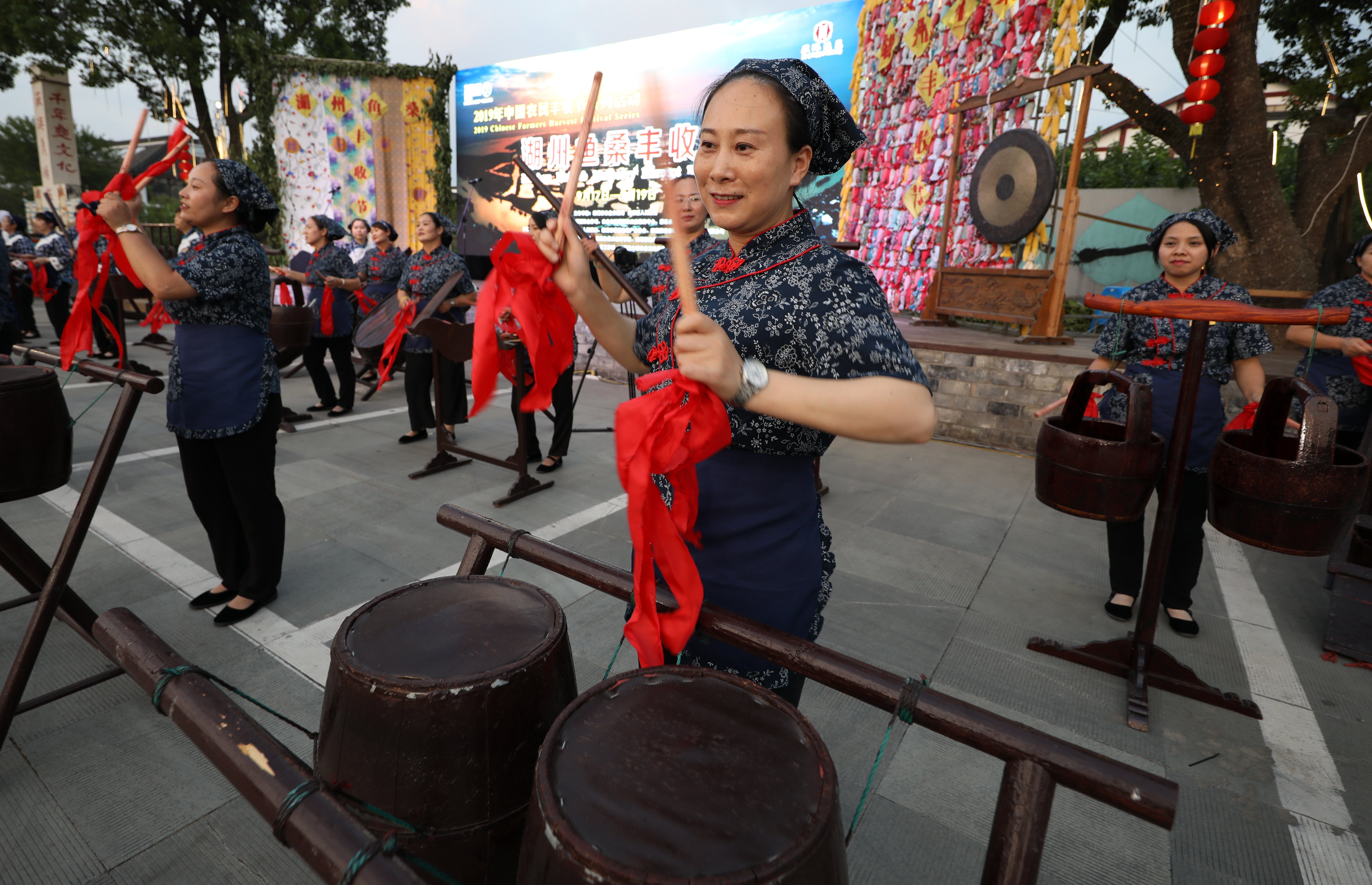 当地村民和国际友人一同唱鱼歌,跳鱼舞、舞鱼龙、敲鱼乐,体验千百年来的江南民俗文化,庆祝桑基鱼塘系统丰收的喜悦,领略湖州桑绿、水秀、鱼丰的生态之美。