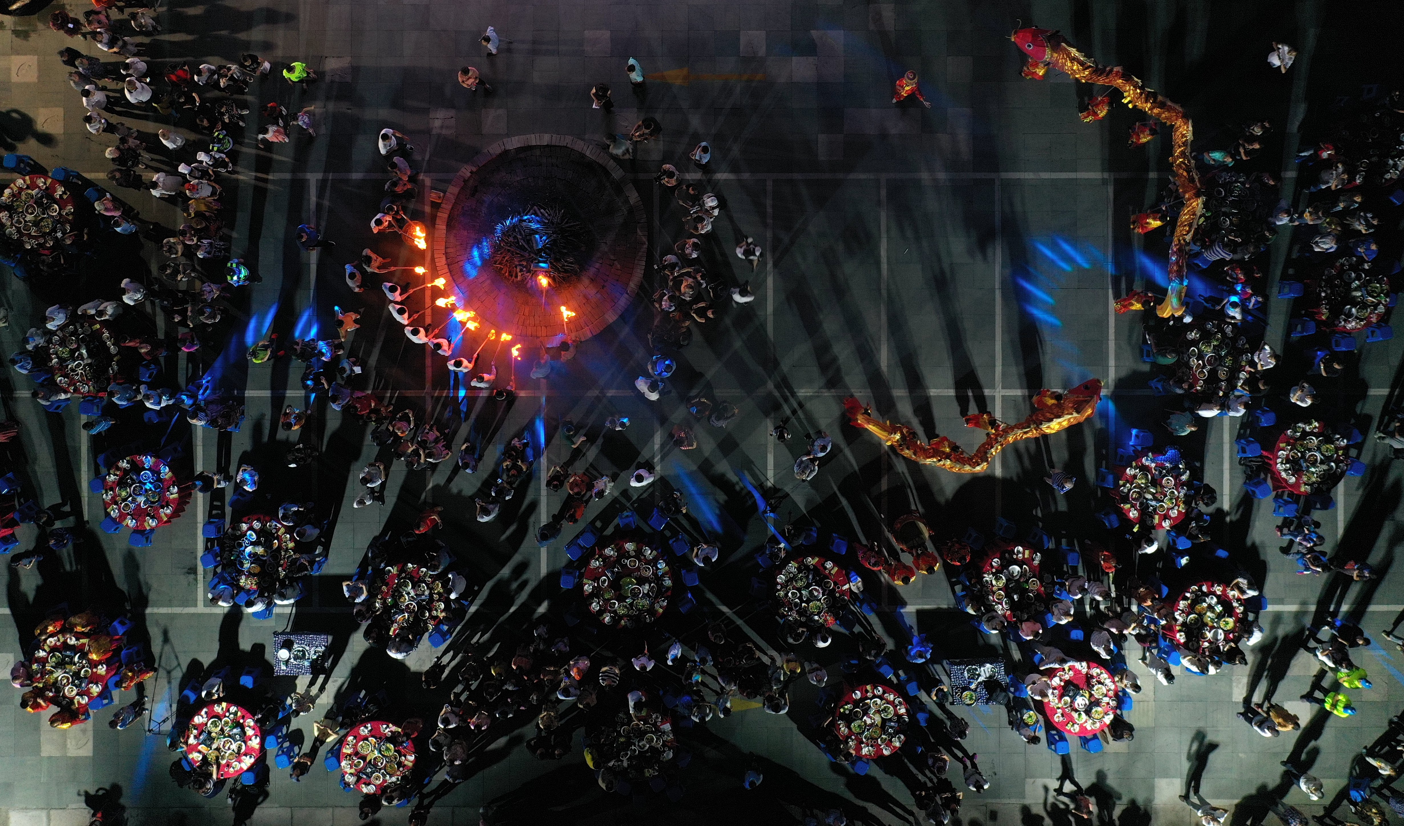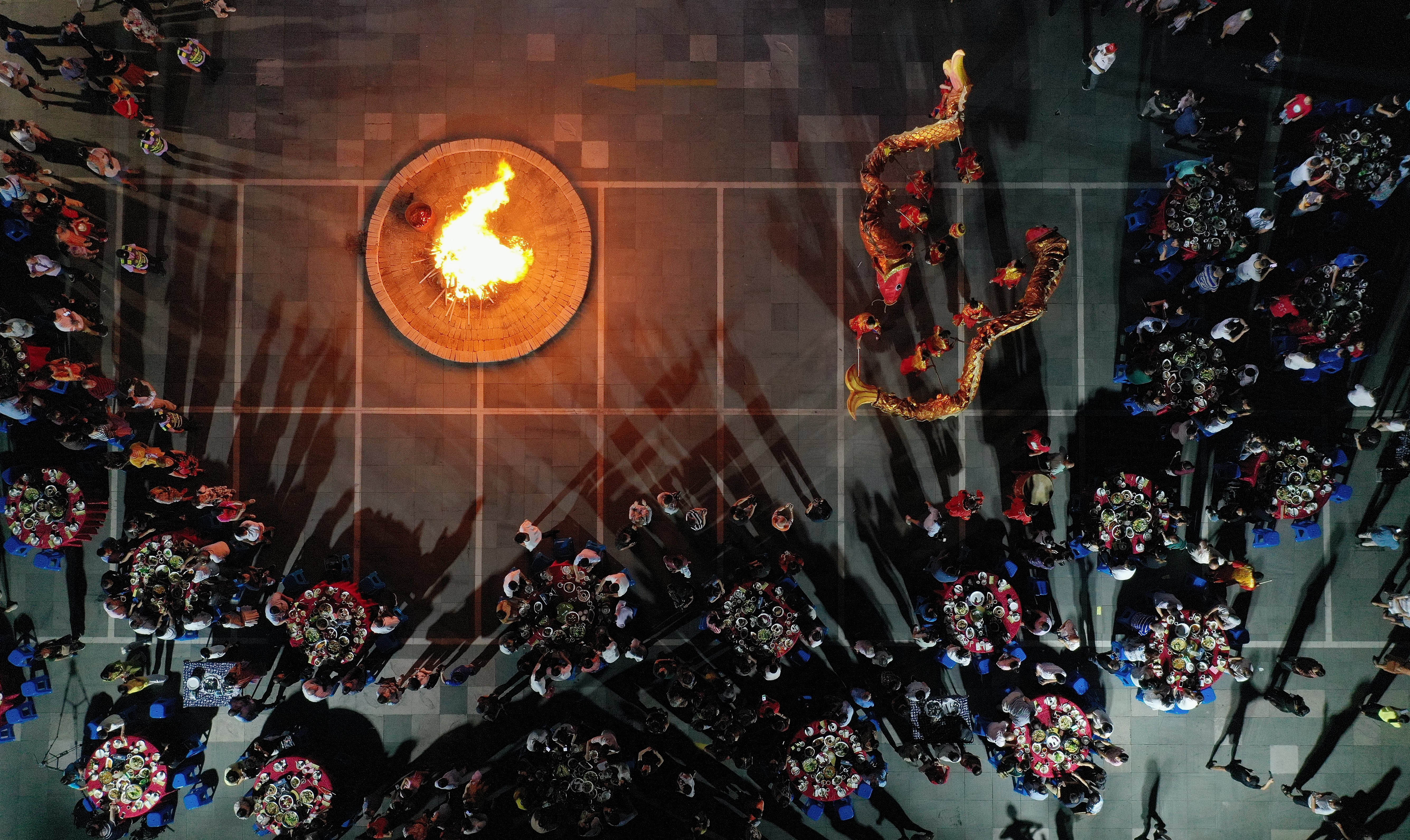 这是当地村民点燃篝火,舞起鱼龙,庆祝丰收。