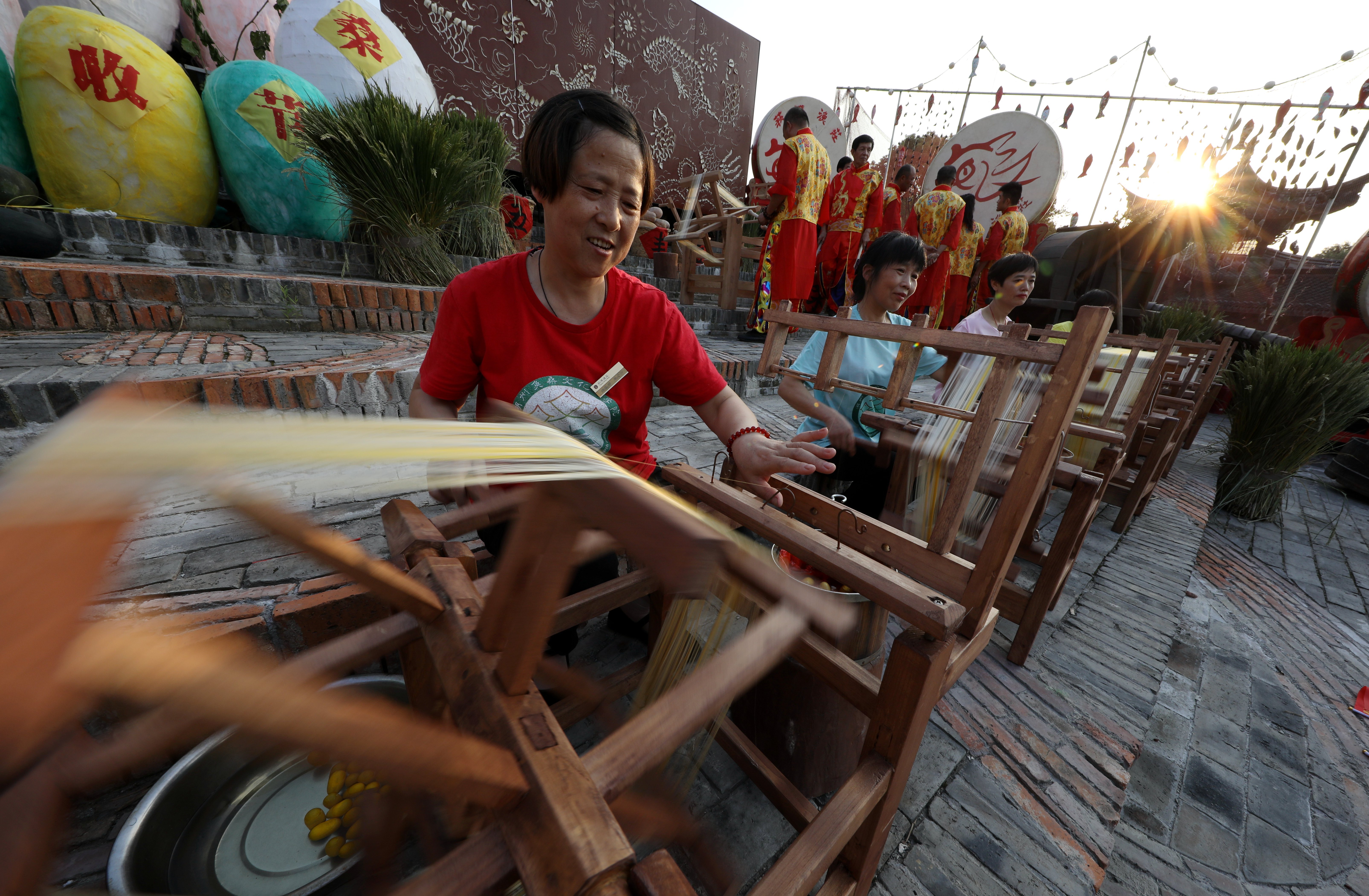这是当地村民正在利用传统技艺进行剥茧拉丝。
