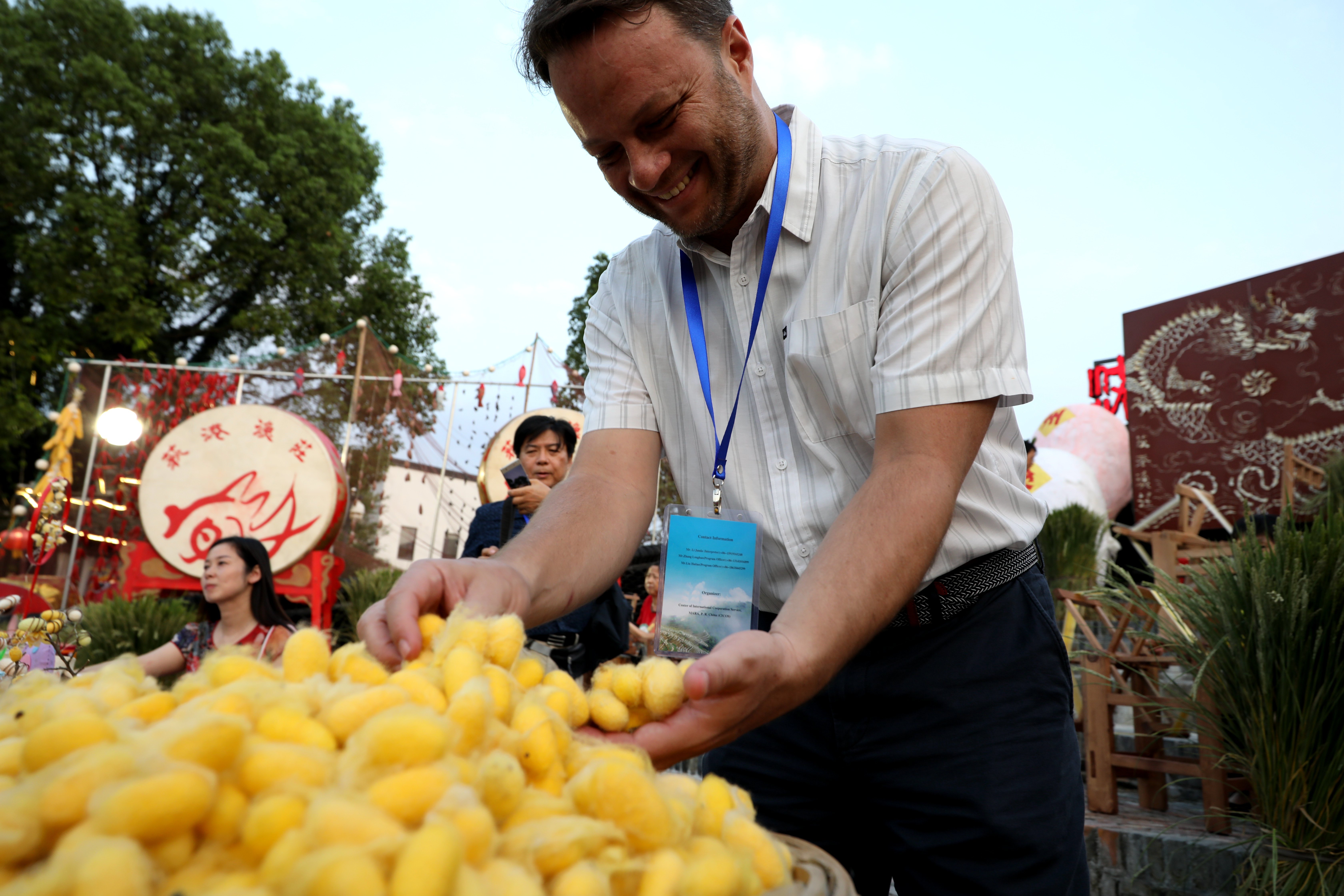 这是一名来自哥伦比亚的国际友人正被当地产的彩色茧深深吸引。