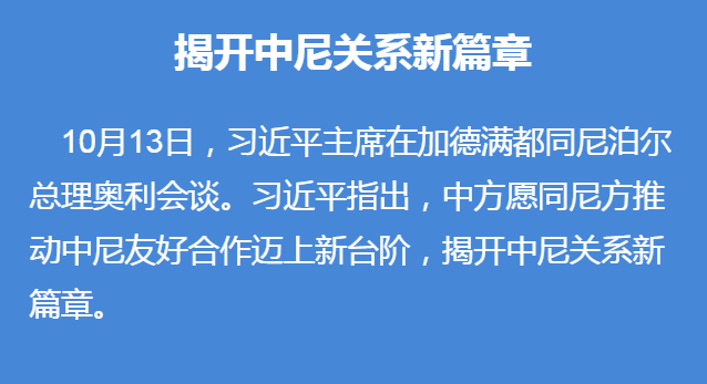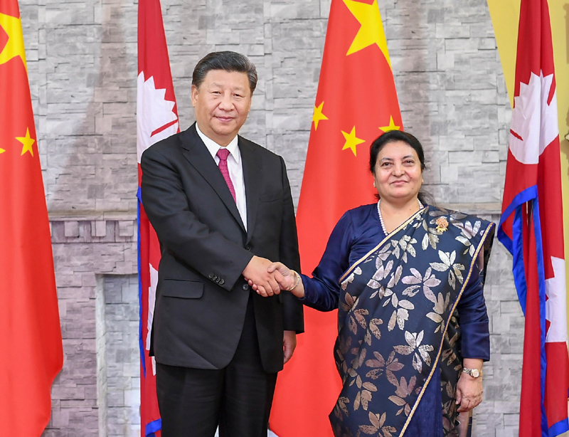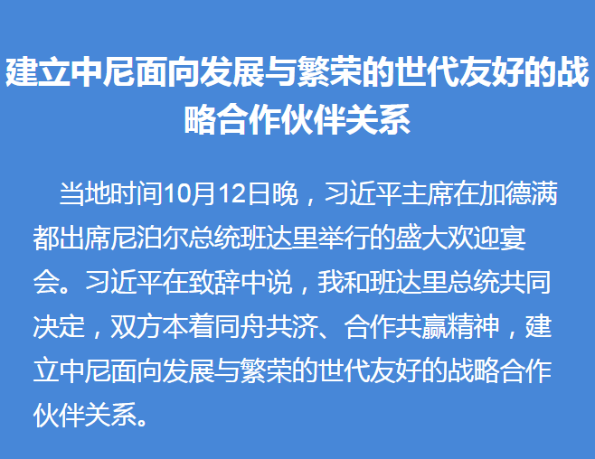 应尼泊尔总统比迪亚·德维·班达里邀请,10月12日至13日,习近平主席对尼泊尔进行国事访问。访问期间,习近平主席会见班达里总统,同尼泊尔总理奥利举行会谈,并出席班达里总统举行的欢迎宴会。
