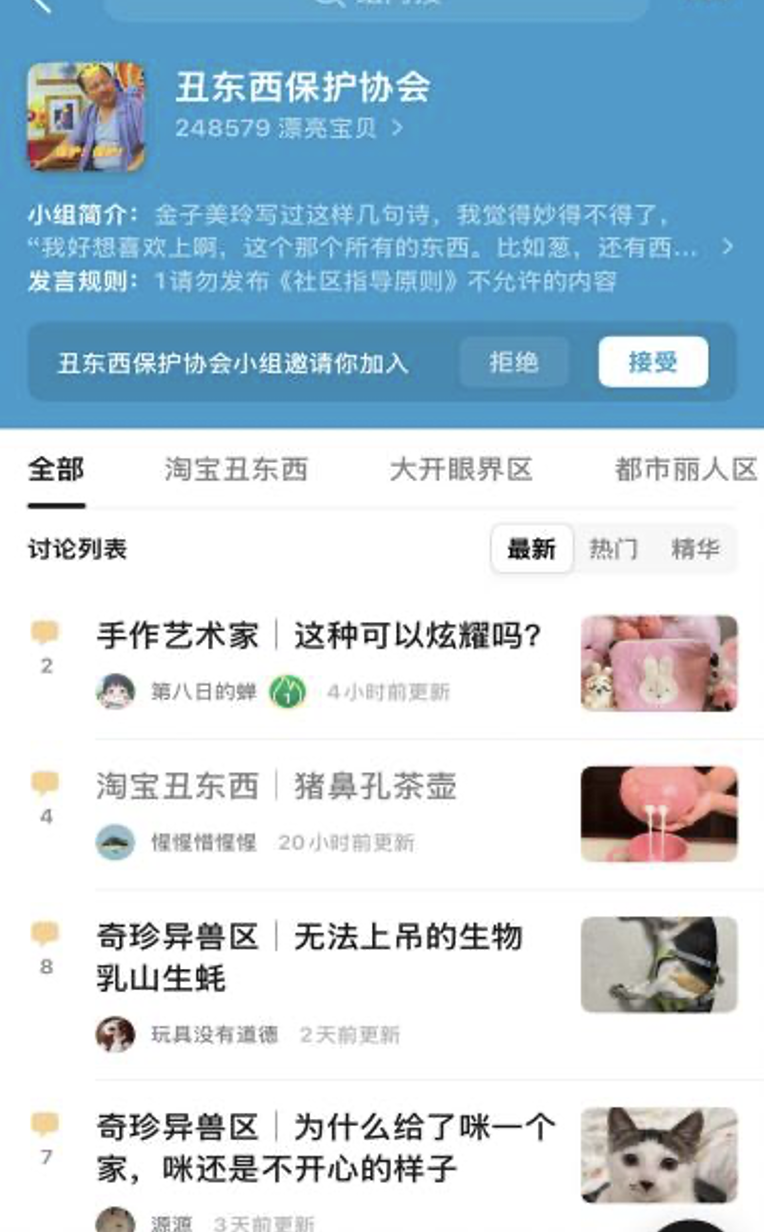 豆瓣平台的“丑东西保护协会”小组,如今已聚集近25万名成员。网友们在分享各类“丑东西”的同时,通过对审美的表达与交流,逐步形成了拥有群体共识的亚文化新潮流。