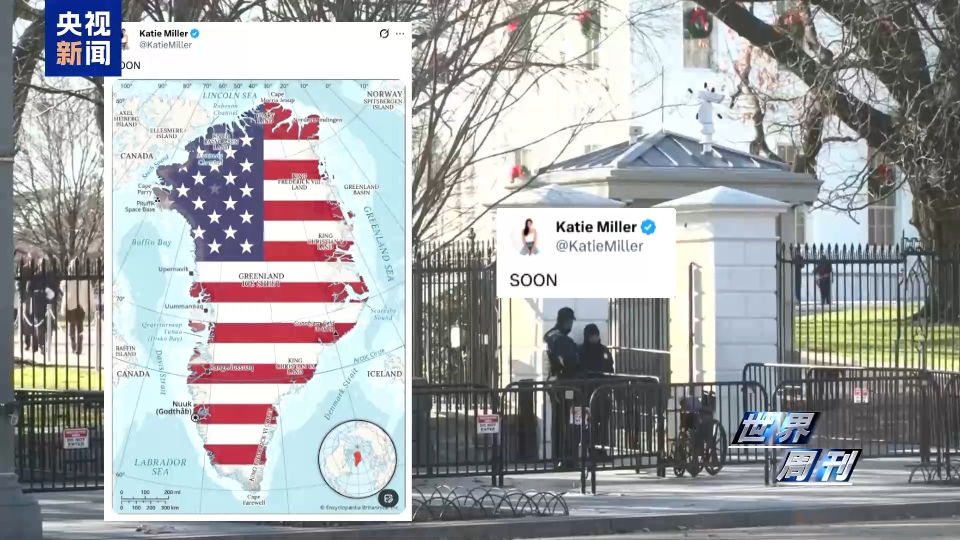 1月3日,美军突袭委内瑞拉当天,白宫办公厅副主任斯蒂芬·米勒的妻子凯蒂·米勒,在社交媒体发布了一则帖文:一张被涂上美国国旗颜色的格陵兰岛地图,配文是大写的英文单词“很快”。
