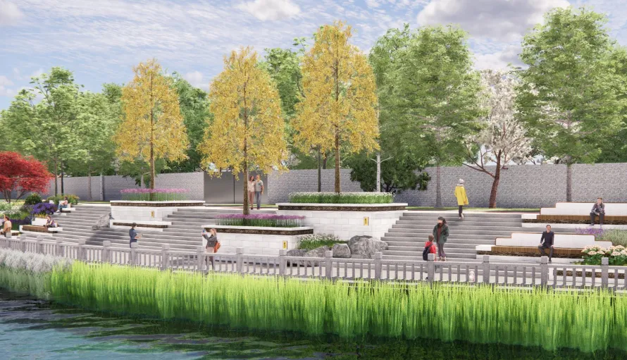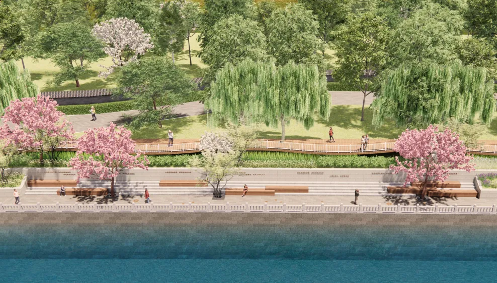 河道南岸架空平台是正玉渊潭公园的观赏跌水最佳视角。工程将扩大此处平台,形成一处植物丰茂的复合休憩空间,并结合附近的会城门遗址、蓟丘文化以及宋金时期文人郊游的典故,打造一个充满诗意的文化空间。在栈道中段拓宽出的小广场,将提供多角度的观景视野,新增的下河台阶极大增强了亲水体验。同时,通过亲水台阶、平台与错落的竹木平台相结合,搭配精心挑选的植物,丰富驳岸变化,形成独特的亲水休憩空间,对玉渊潭樱花文化的表达不仅限于栽种樱花树,更通过引入樱花诗词与科普,让游客在沉浸式体验中感受传统文化的魅力。