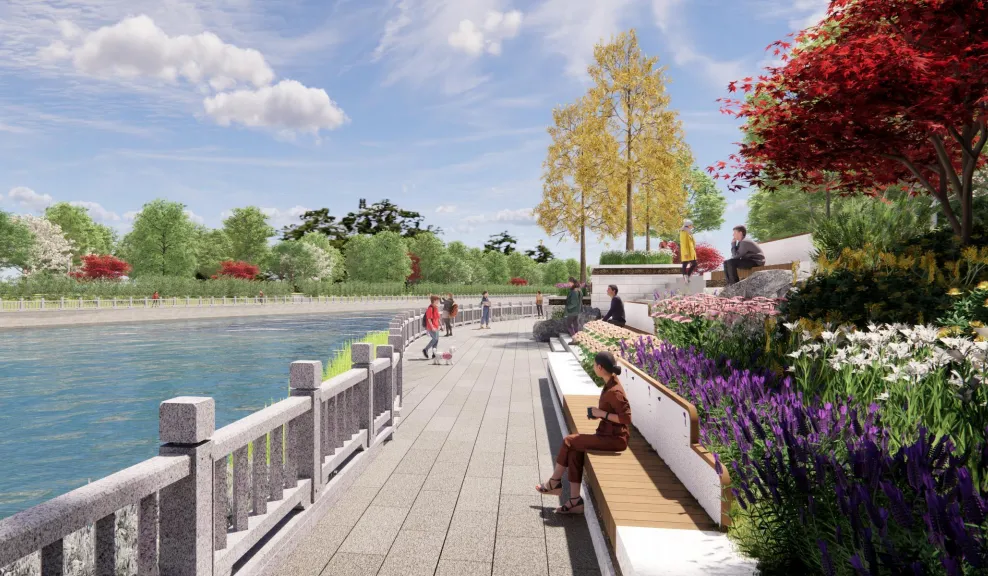 针对以往护坡破损、岸线硬化、生态状况差等问题,工程将进行系统性修复,构建拥有自净能力的生态岸线。在植物配置上,精选了兼具生态适应性与观赏性的品种。挺拔的华山松、白皮松、银杏、国槐,秋色斑斓的元宝枫、栾树,春季烂漫的二乔玉兰、日本晚樱、山桃、山杏,以及狼尾草、八宝景天、千屈菜、马蔺、松果菊等形态各异的地被和观赏草,将共同构成一幅四季分明、色彩斑斓的滨水生态画卷。