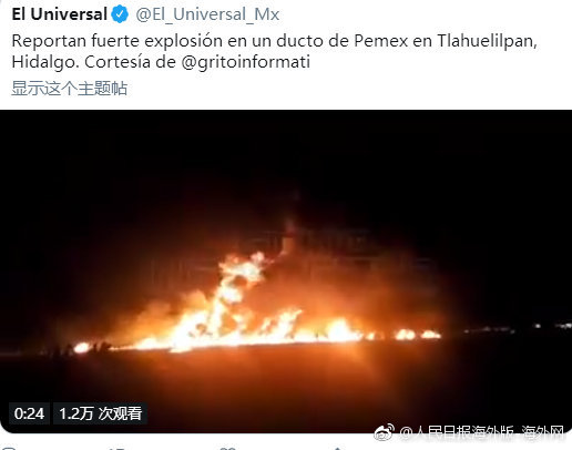 [快讯!墨西哥中部输油管道爆炸 火光冲天]据俄罗斯卫星通讯社报道,当地时间周五(18日),墨西哥中部一座城市输油管道破裂并发生爆炸,造成多人受伤。据墨西哥中部伊达尔戈州的政府电视台报道,有多人在试图往容器里装燃料时被烧伤。州长法亚德(Omar Fayad)对当地电视台表示,目前还不知是否有人死亡,但他接到报告称,爆炸中有许多人被烧伤。