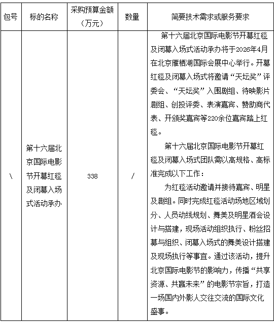 第十六届北京国际电影节开幕红毯及闭幕入场式活动承办项目招标公告