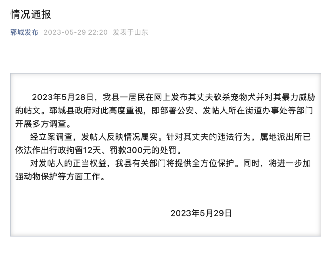 2023年5月28日,该县一居民在网上发布其丈夫砍杀宠物犬并对其暴力威胁的帖文。郓城县政府对此高度重视,即部署公安、发帖人所在街道办事处等部门开展多方调查。
