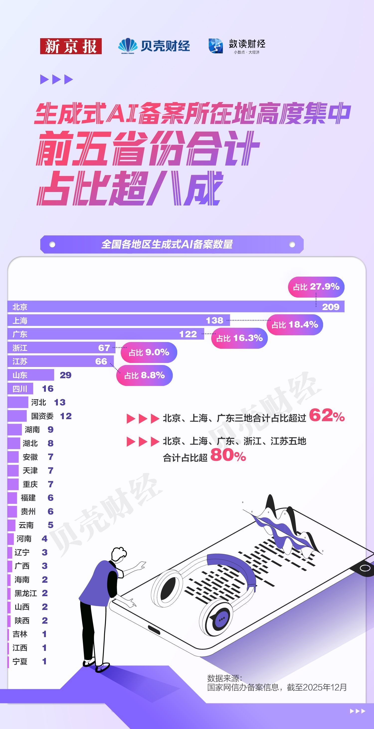 生成式人工智能服务的备案情况,则标志着技术正式进入公共市场与规模化运营阶段。自2024年4月起,国家网信办开始公布生成式人工智能服务的备案信息。截至2025年12月31日,全国共有748款生成式人工智能服务完成备案,其中前五地区合计占比超过80%。其中,北京在模型数量和类型上均表现出较强的多样性,既包括通用大模型,也涵盖面向政务、金融、科研等场景的专业化模型,数量总计209个,占比近三成。2026年北京两会期间最新数据显示,北京备案大模型数量已达到212款。