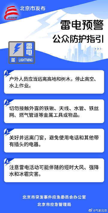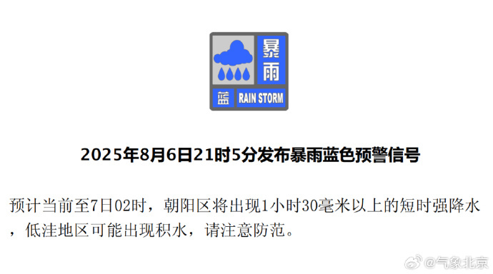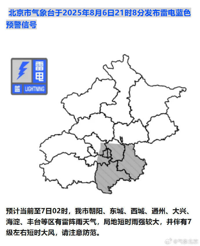 据北京市气象局消息,8月6日21:08,北京市发布雷电蓝色预警。