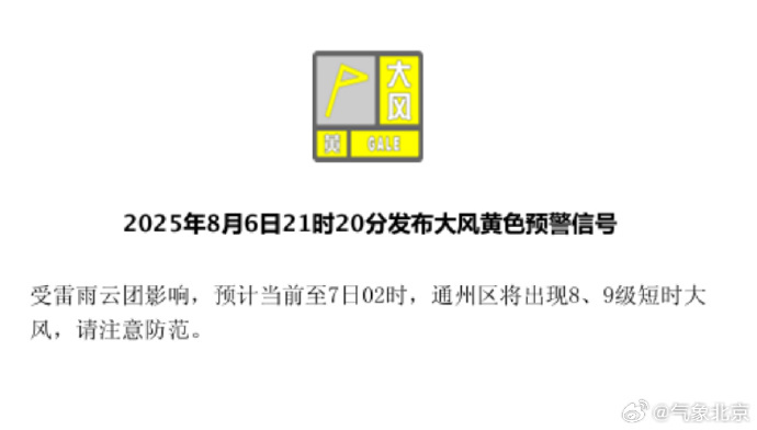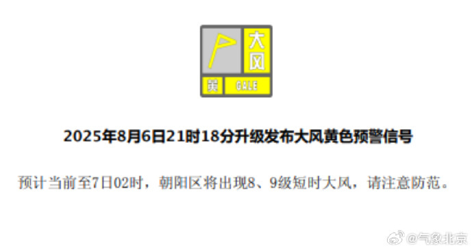 朝阳区先后发布暴雨蓝色、大风黄色预警信号,通州区发布大风黄色预警信号。