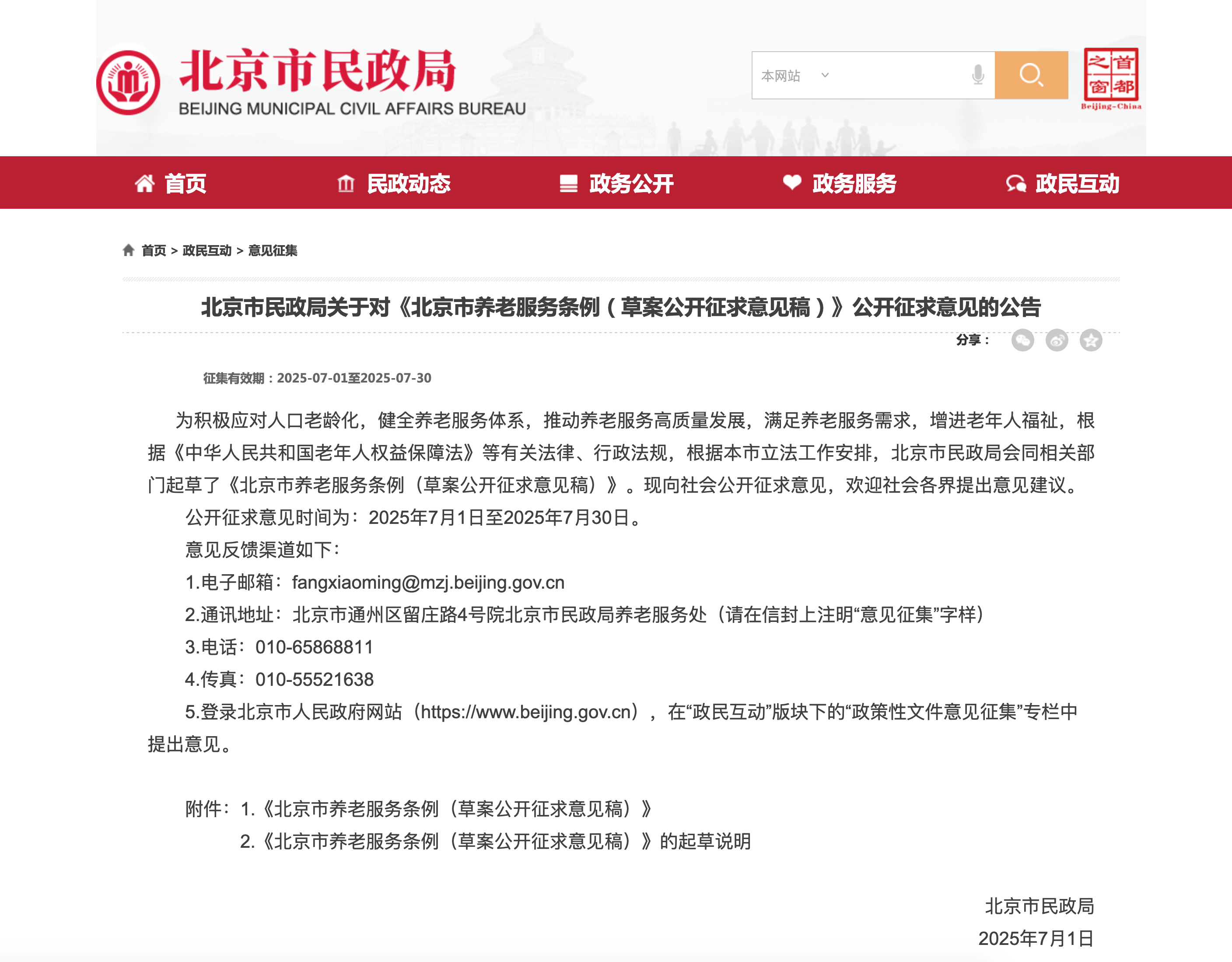 为应对人口老龄化,健全养老服务体系,推动养老服务高质量发展,满足养老服务需求,增进老年人福祉,市民政局会同相关部门起草的《北京市养老服务条例(草案公开征求意见稿)》面向社会公开征求意见。征求意见将一直持续至7月30日。