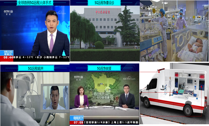 5G智慧医院:5G远程人体手术、5G远程会诊、5G远程超声、5G应急救援、VR新生儿探视、急救车全景展示充分展现中国移动医疗行业全面布局。