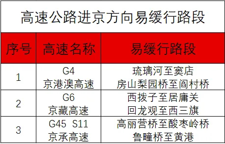 假期最后三日将逐步迎来返程高峰,预计下午16时至晚间19时主要高速公路进京方向部分路段车流较大,京承主站、京藏清河等高速公路主线收费站以及部分进京检查站可能出现短时排队情况。
