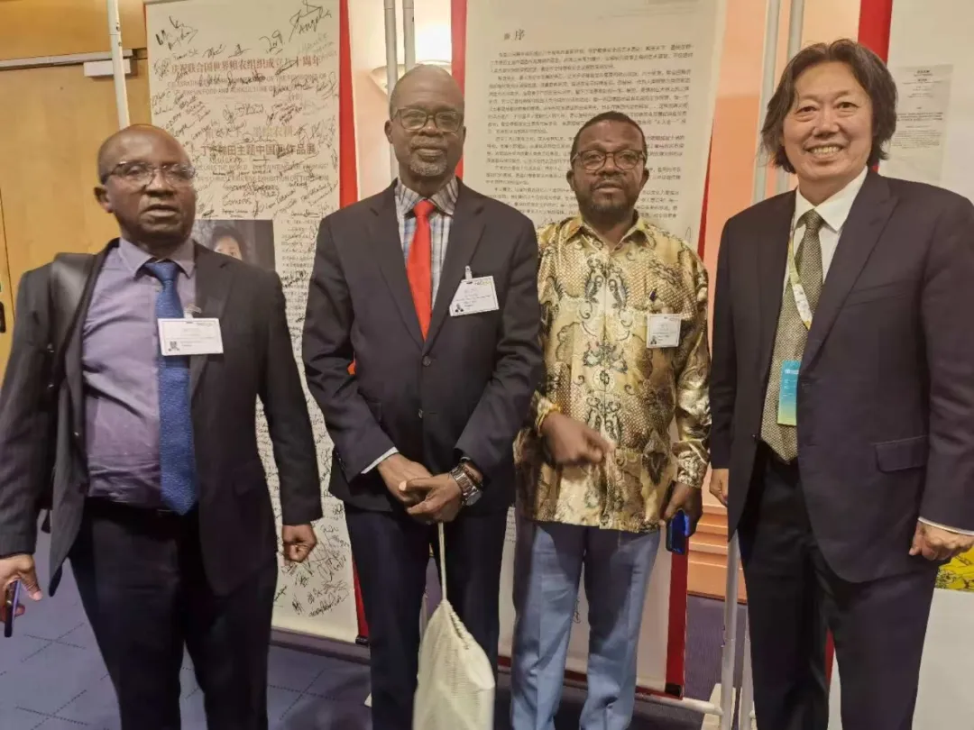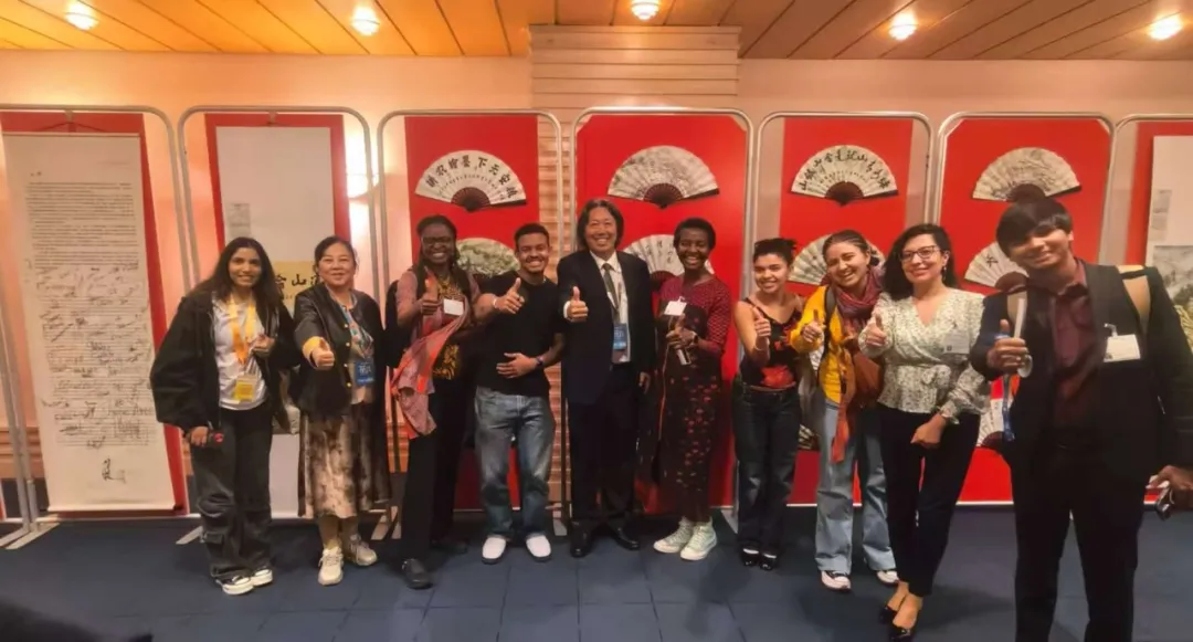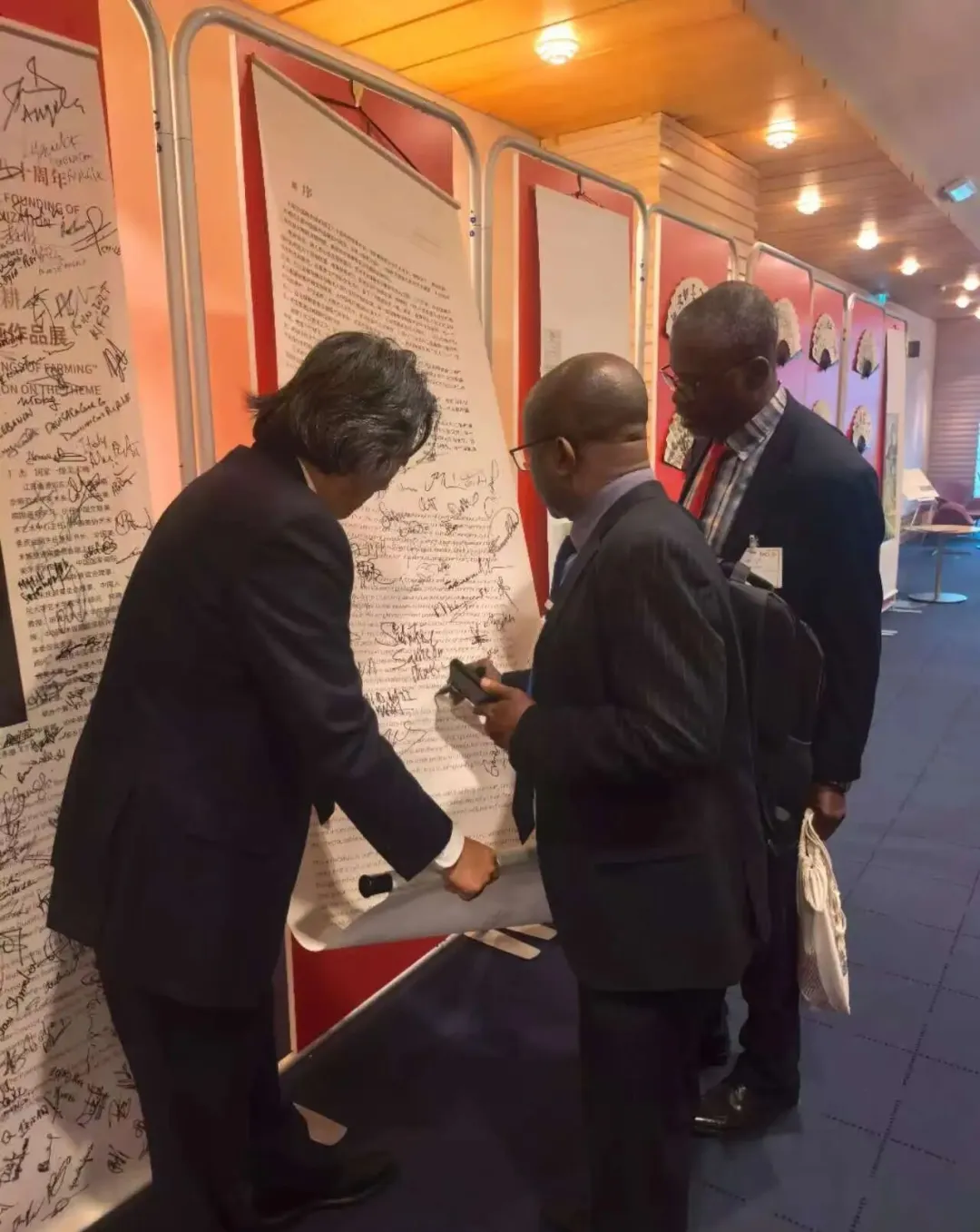 粮农天下.墨绘农耕丁杰梯田主题中国画作品展上丁杰与各国嘉宾交流签字留影