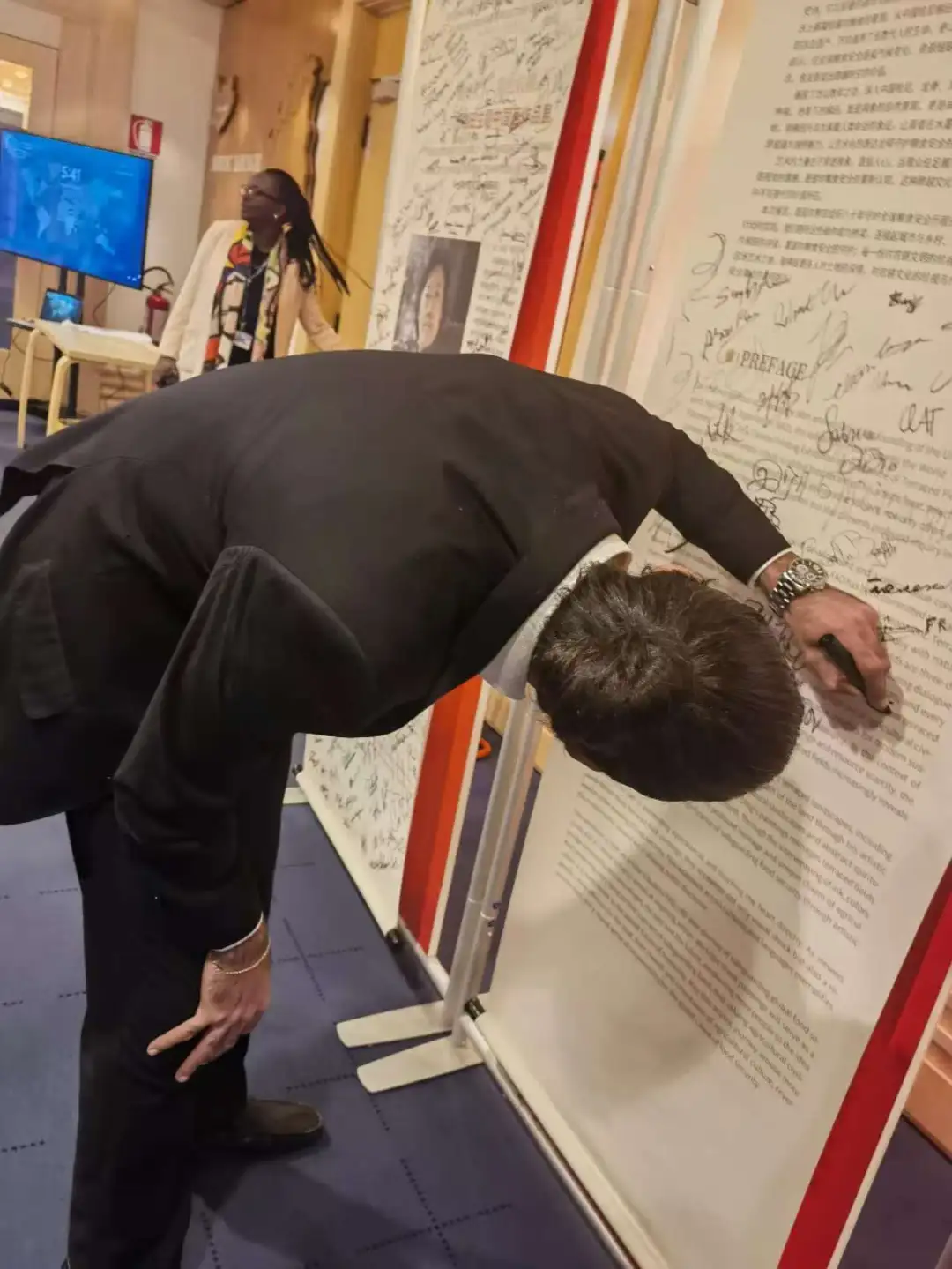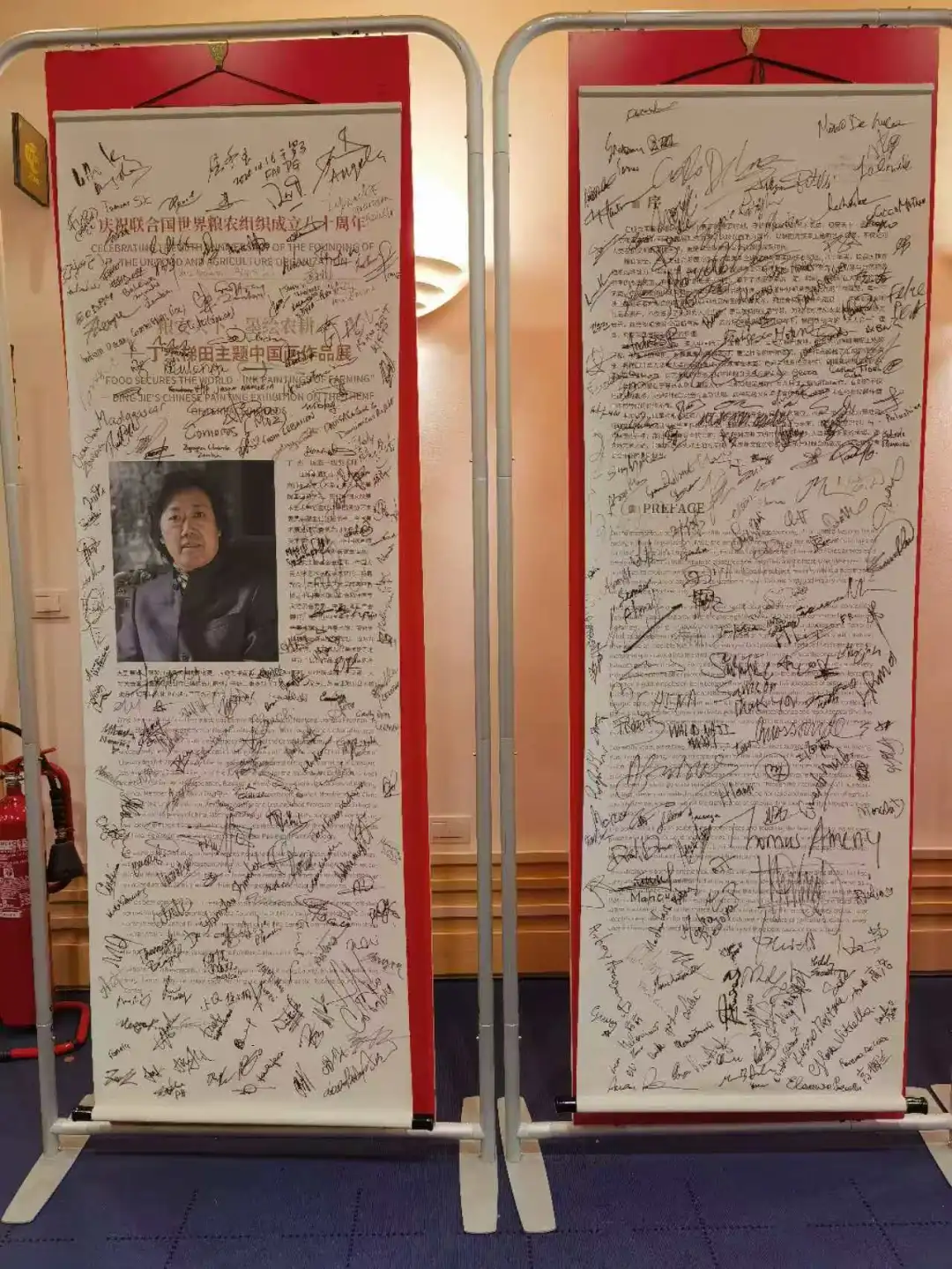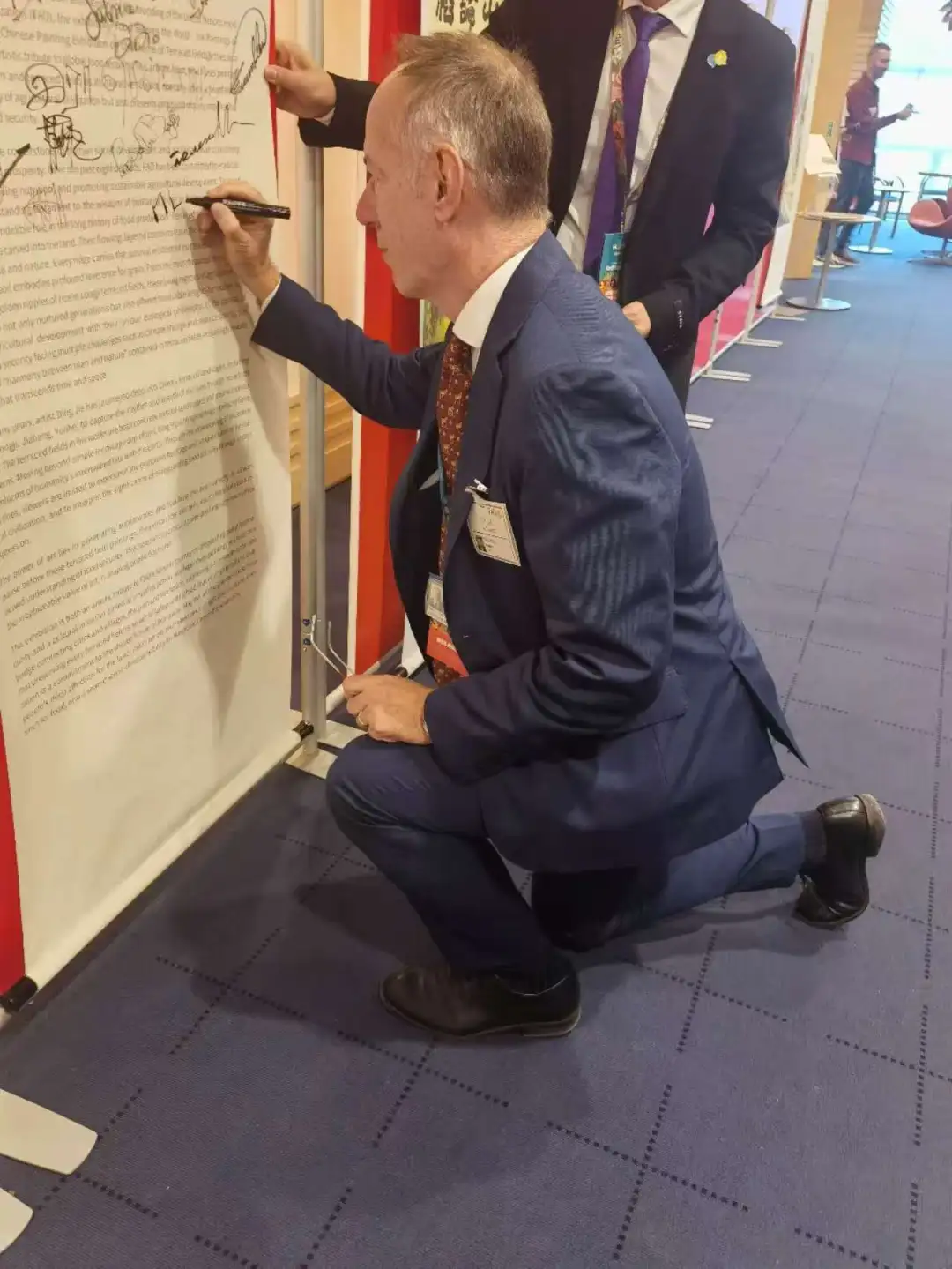 粮农天下.墨绘农耕丁杰梯田主题中国画作品展上丁杰与各国嘉宾交流签字留影