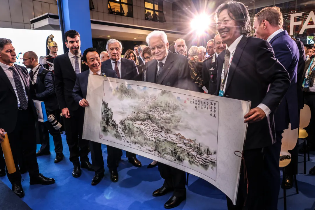 粮农组织总干事将中国画家丁杰的画作《步步登高源远流长》在仪式现场赠予意大利总统,并介绍了画作创意,总统赞扬画作并表示感谢。