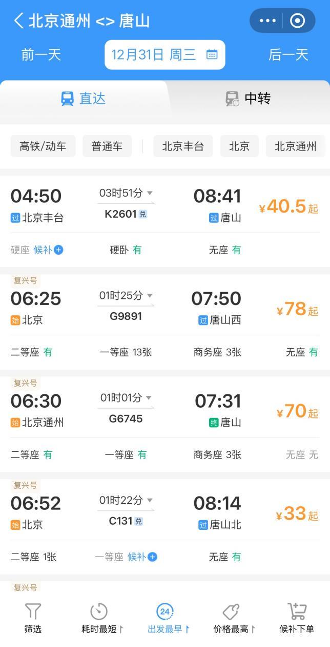 北京时间在12306小程序上查询得知,从北京通州站到唐山站、宝坻站、北辰站、秦皇岛站的列车线路均已开通。