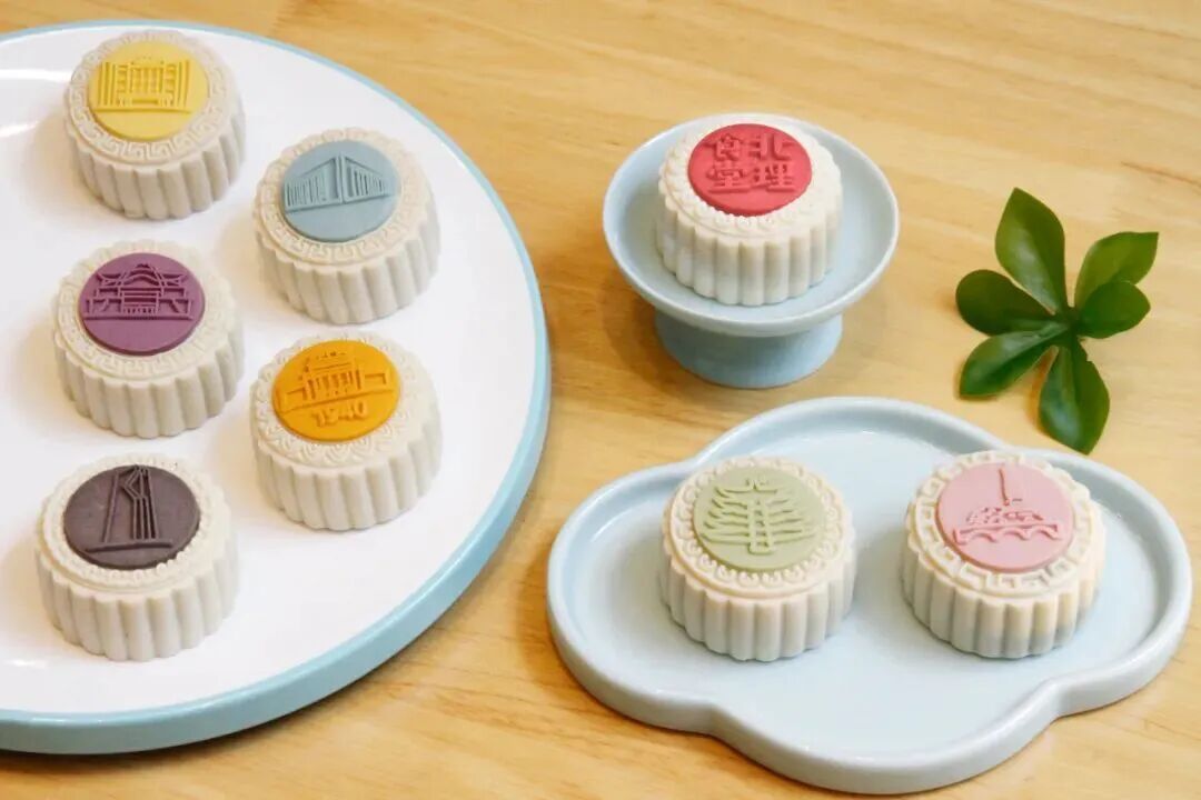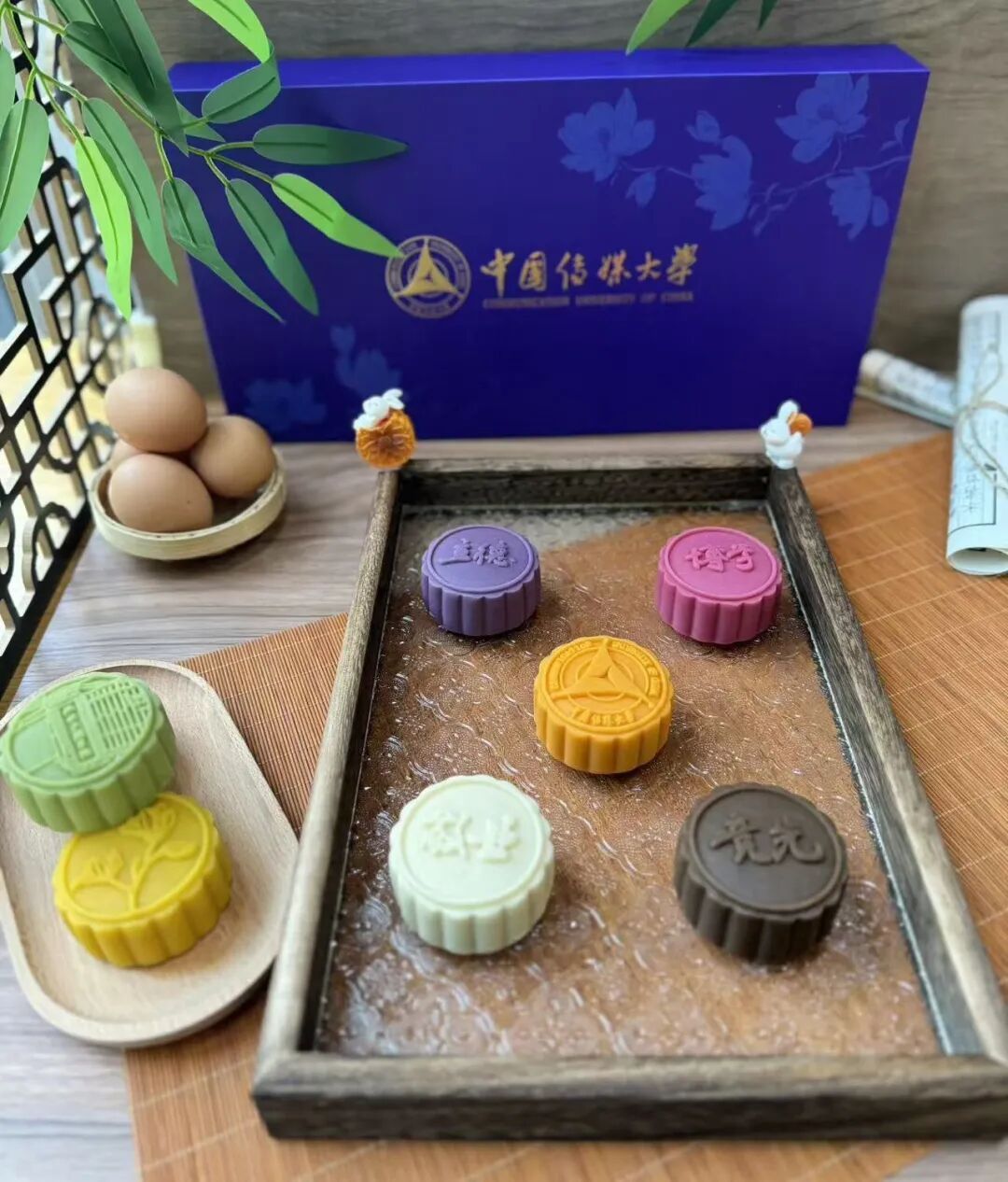 冰皮月饼礼盒颜值与口感双双在线。既有橘黄色校徽款:椰皇芝士味,也有紫色立德款:桃山黑芝麻味、白色敬业款:莲蓉蛋黄味、酒红色博学款:芋泥乳酪Q心味、巧克力色竞先款:桃山巧克力味、黄色玉兰花款:桃山奶黄味、粉色玉兔款:低糖芋泥奇亚籽味、绿色广院西门款:羽衣甘蓝芝士味。