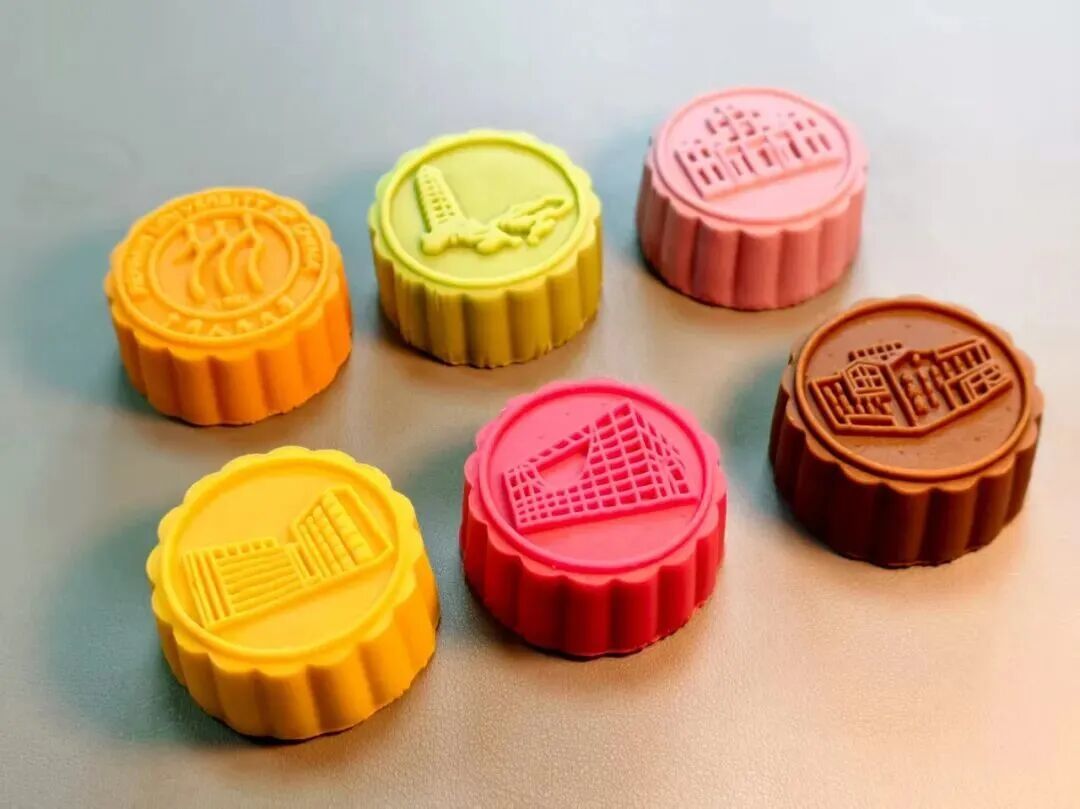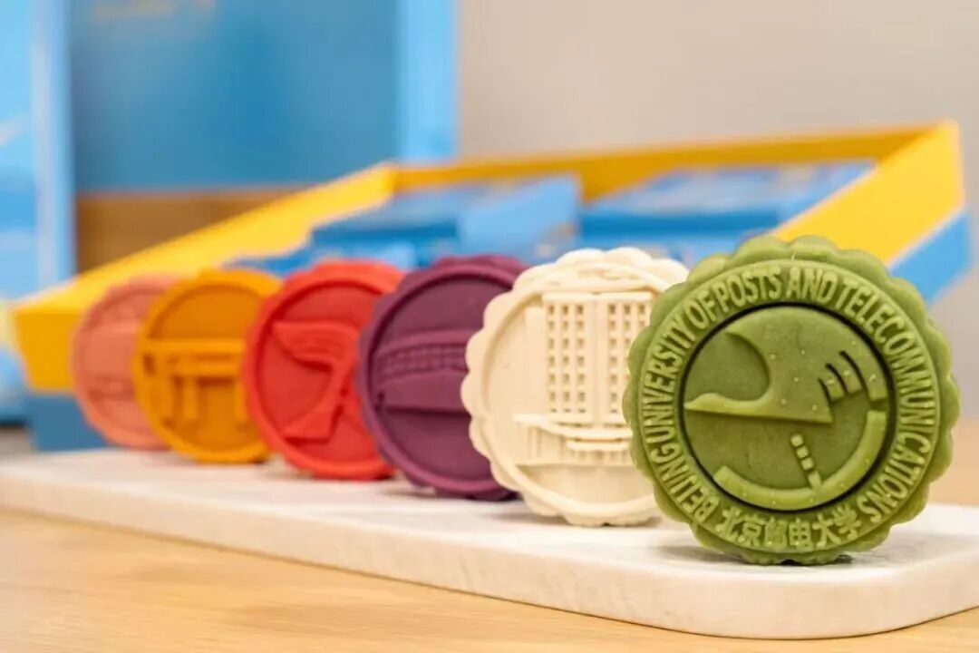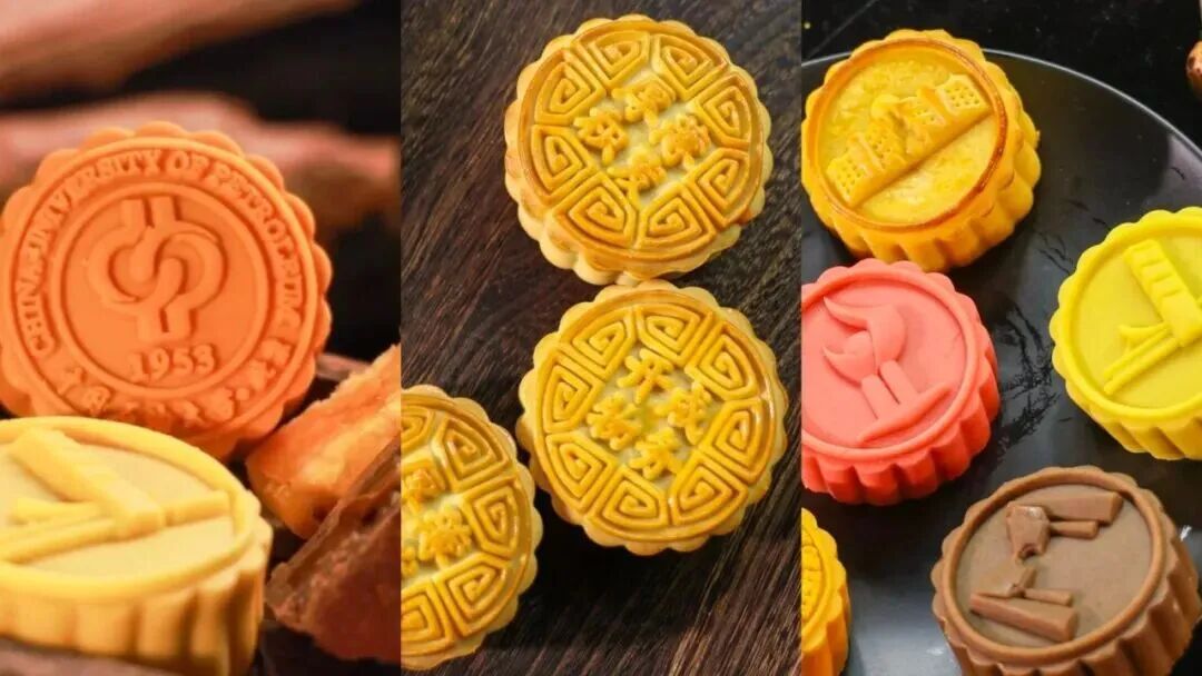 “校徽”系列月饼传递办学使命,两个循环往复的油滴代表能源与资源;“校训”系列月饼将“厚积薄发、开物成务”的校训拓印在饼皮上;“地标”系列月饼则把图书馆、体育馆等校园地标记忆藏于其中。