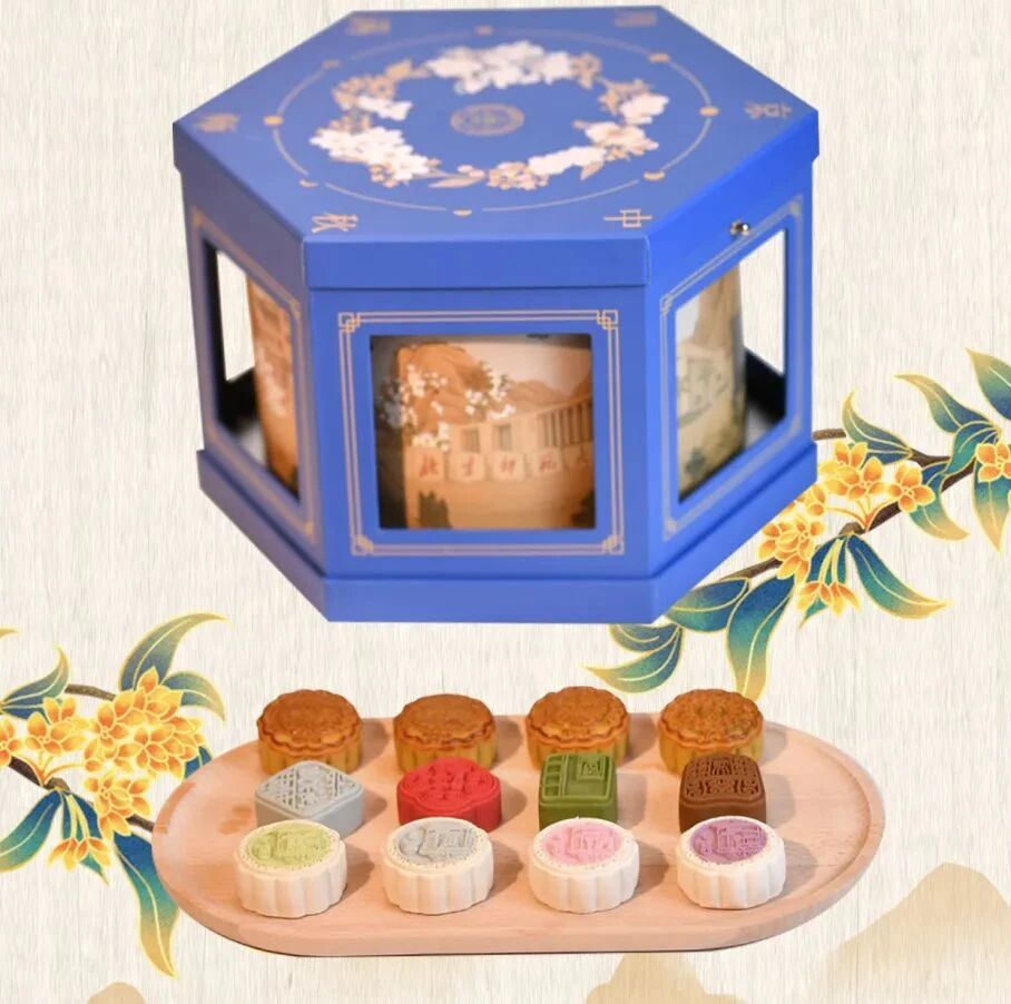 “阖悦满井”礼盒以深蓝色为主调,封面采用镂空设计,融入圆月、云海、主楼剪影,蛋黄、奶酪核桃、五仁、巧克力坚果等六种口味的提江月饼,六味六样,唇齿留香。