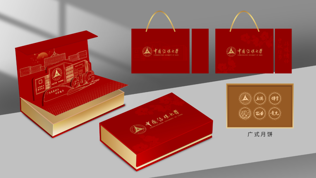 礼盒以红蓝为主色调,将主楼、文化广场等标志性校园景致巧妙融入设计;每一枚月饼都是精致的“微缩景观”,校徽的庄重、玉兰的清雅、老西门的复古,与玉兔追月的灵动相映成趣。它不是普通的月饼礼盒,而是把“中传故事”藏进方寸间的纪念,是能随时触摸校园温度的“移动明信片”。