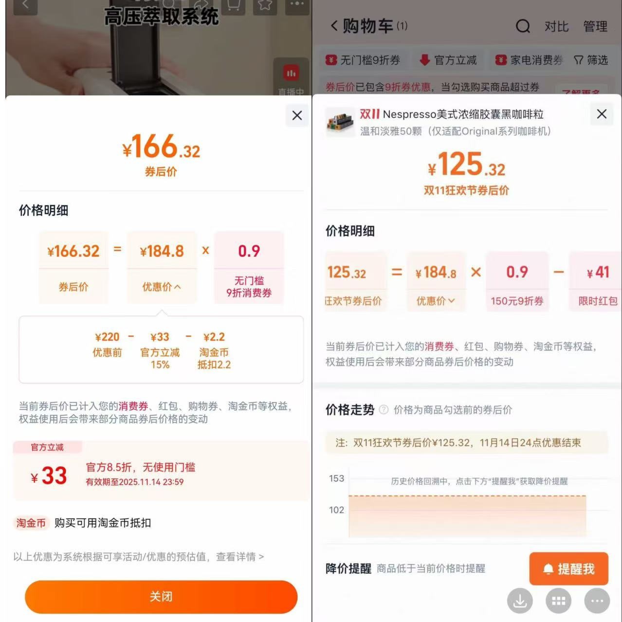 “同一家店,同款商品,我和同事看到的价格竟然相差40多元!”几天前,刘女士在选购一款咖啡胶囊时发现了这件怪事。她的页面显示166.32元,同事却只需125.32元。“我们都是88VIP,也都不是这家店的会员。”刘女士联系客服后,对方将差价归因于“积分兑换”,但这个解释让她难以信服:“这40元优惠是店铺主动推的,不是我同事用积分领的。”