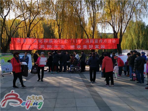 为切实做好本市文化和旅游行业“119”消防宣传月活动,大力普及消防法律法规和消防安全知识,提升市民游客、文化和旅游从业人员消防安全意识和自救互救能力,确保行业冬春防火形势稳定,2019年11月8日,北京市文化和旅游行业2019年“119”消防宣传月活动启动仪式在青年湖公园举行。北京市文化和旅游局安全与应急处、东城区文化和旅游局相关负责同志,部分宾馆饭店、景区从业人员参加现场咨询。