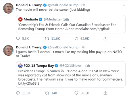 12月26日,特朗普在推特上转发了福克斯新闻有关CBC剪掉自己客串镜头的报道并愤怒点名特鲁多说:“我猜贾斯汀(特鲁多)不太喜欢我让他为北约或贸易买单!”不仅如此,他还继续转发相关报道说,“电影永远都不一样!(开个玩笑)”。