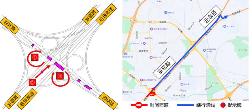 绕行路线:在京密路出京方向入四环内环匝道口南侧设置提示标志,提示车辆继续沿京密路向北→将台路→芳园西路→霄云桥下左转→四环路绕行(绕行距离2.8km)。