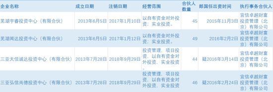 郎国任控股的"吉林市翔实晟投投资中心",其执行事务合伙人、受益所有人,就是宜信旗下的基金销售公司"普泽众富"。更巧合的是,2015年和2016年,郎国任成为芜湖和三亚4家投资中心的股东,这4家投资中心的执行事务合伙人皆为宜信卓越财富投资管理(北京)有限公司。