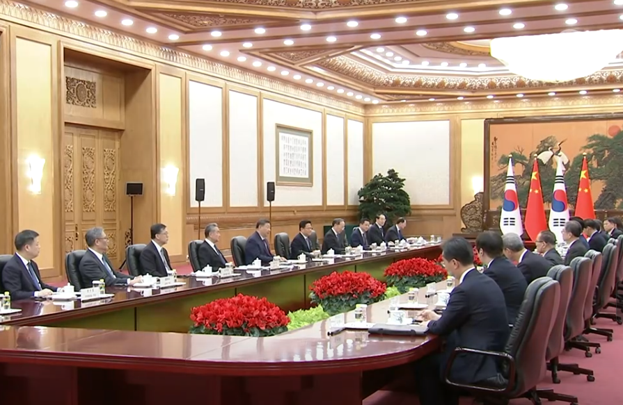 习近平指出,当前世界百年变局加速演进,国际形势更加变乱交织。中韩在维护地区和平、促进全球发展方面肩负重要责任,有广泛利益交集,应当坚定站在历史正确一边,作出正确战略选择。80多年前,中韩两国付出巨大民族牺牲,赢得抗击日本军国主义的胜利。今天更应携手捍卫二战胜利成果,守护东北亚和平稳定。作为经济全球化的受益者,中韩要共同反对保护主义,践行真正的多边主义,为推进平等有序的世界多极化、普惠包容的经济全球化作出贡献。