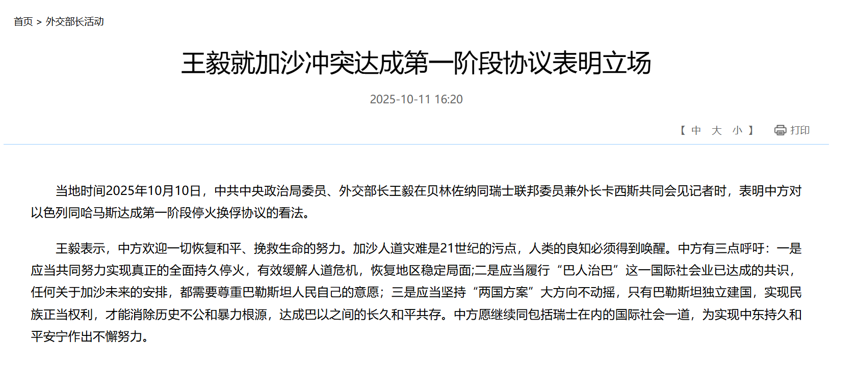 据外交部网站消息,当地时间2025年10月10日,中共中央政治局委员、外交部长王毅在贝林佐纳同瑞士联邦委员兼外长卡西斯共同会见记者时,表明中方对以色列同哈马斯达成第一阶段停火换俘协议的看法。