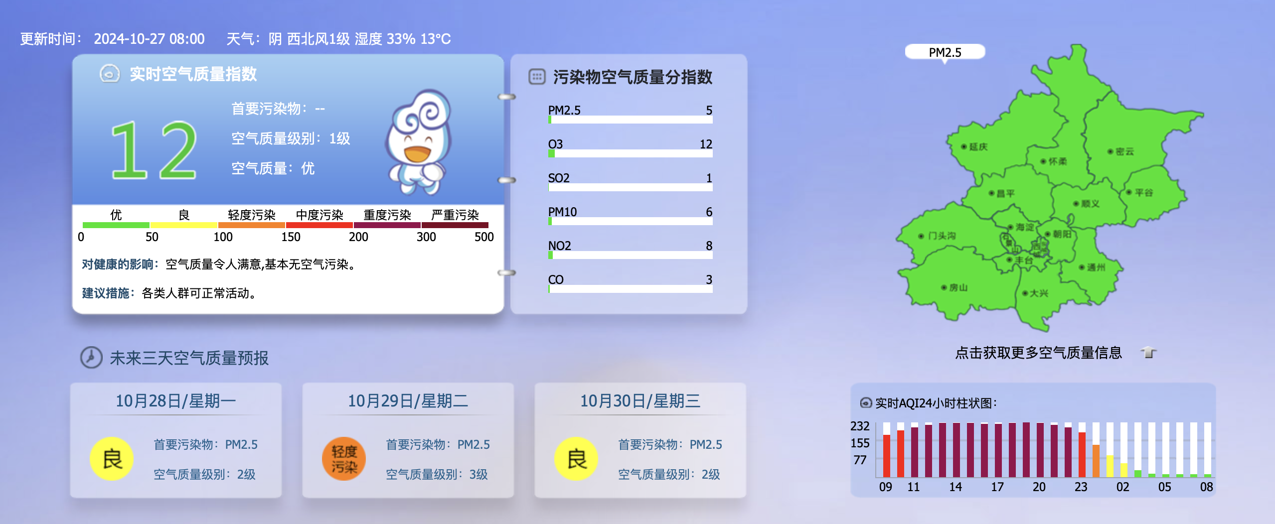 据北京市生态环境监测中心,10月27日8时,北京空气质量指数为12,空气质量优,基本无空气污染。