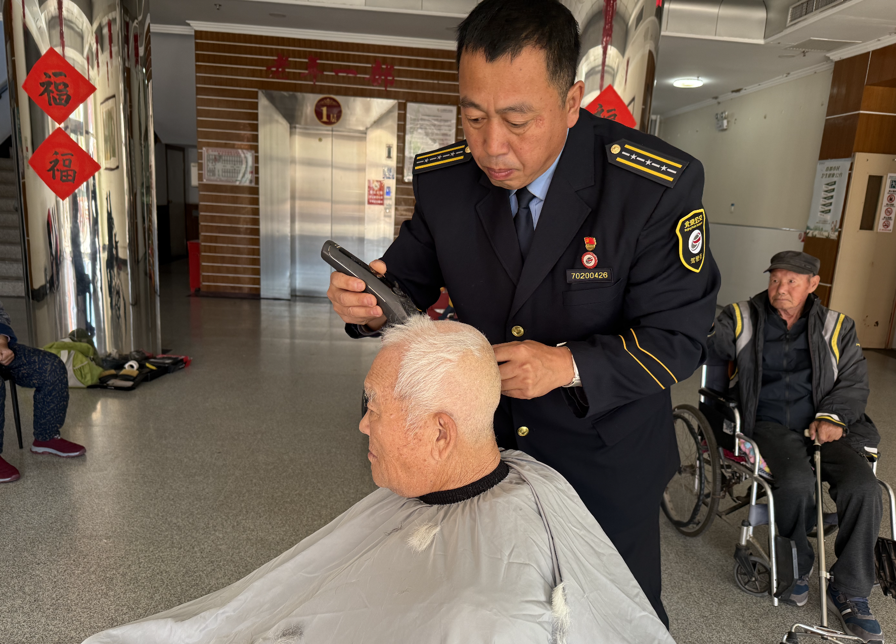 院子里,温暖和煦的阳光洒满小院,看到公交职工们的到来,老人们和蔼的脸上都露出了笑容。852路驾驶员王艳茂带领着几位同事准备好理发工具。老人们提前排好了顺序,满心欢喜地等待熟悉人帮他们理发。职工们边理发边和老人聊天、唠家常,“大爷,您最近身体怎么样啊?”刘宁师傅关切地问道。大爷笑着说:“好着呢,看到你们来了,心里啊,更高兴了,感觉身体都更有劲儿了。”918路驾驶员李庆贺师傅问道:“大娘,给您理的发还满意不?”“满意满意,就盼着你们来呢。”看着理好的头发,大娘的满意溢于言表。理完发后,他们拿起清扫工具帮着老人们打扫房间、擦桌子、玻璃,大家你一言我一语,欢声笑语弥漫在“温暖之家”的各个角落。