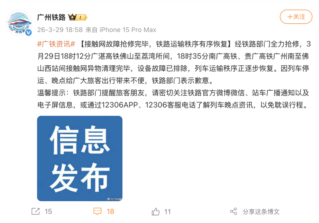3月29日晚间,@广州铁路 再次发布消息称,经铁路部门全力抢修,3月29日18时12分广湛高铁佛山至荔湾所间,18时35分南广高铁、贵广高铁广州南至佛山西站间接触网异物清理完毕,设备故障已排除,列车运输秩序正逐步恢复。因列车停运、晚点给广大旅客出行带来不便,铁路部门表示歉意。