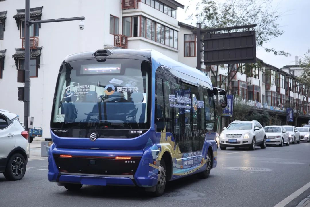 11月18日,一辆无人驾驶小巴士行驶在乌镇街头接送乘客图源:潮新闻客户端