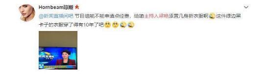 看网友的截图,梁艳的衣服确实有点老了,衣服的边沿都有点变形了,怪不得粉丝表示看不下去,希望给梁艳换个衣服啊。