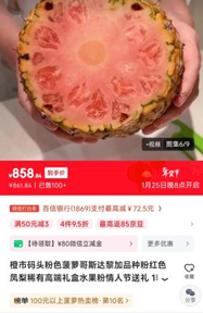在各大电商平台上,真红美铃黑草莓的价格普遍在每斤315元左右。而一颗哥斯达黎加的粉菠萝价最高可达858元,两者价格均比普通同类水果高出10倍以上。