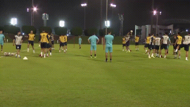 伊朗国家足球队前锋迈赫迪·塔雷米(9号球衣)与队友进行传接球训练。