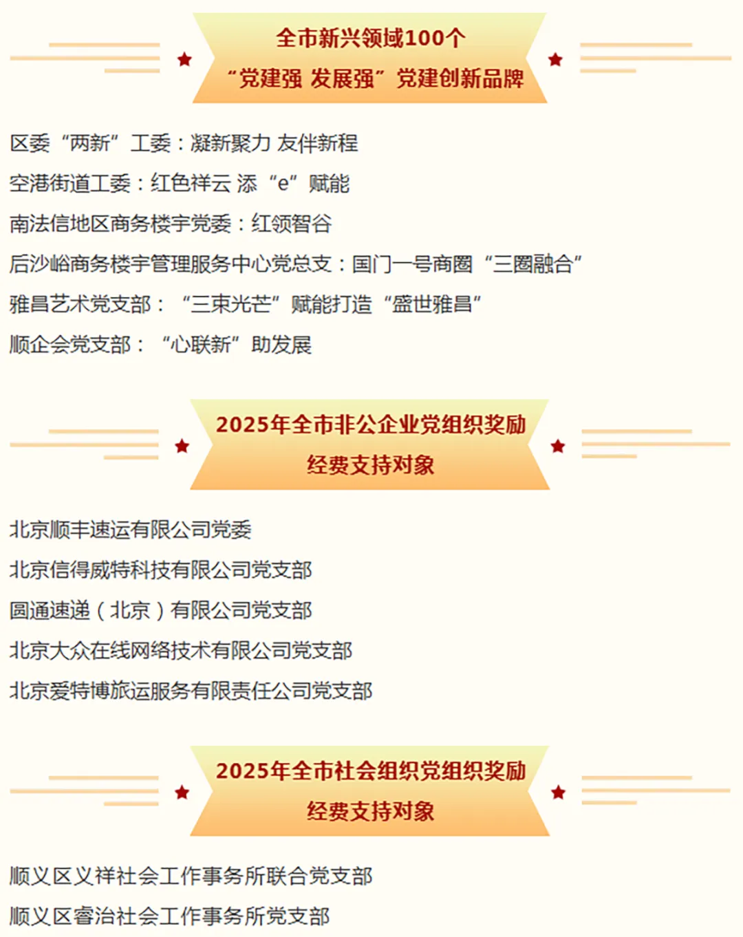 顺义区融媒体中心消息 近日,顺义区6个党建品牌获评全市新兴领域100个“党建强 发展强”党建创新品牌,5个非公企业党组织获评市级非公企业党组织奖励经费支持对象,2个社会组织党组织获评市级社会组织党组织奖励经费支持对象,为顺义区新兴领域党建注入新活力。