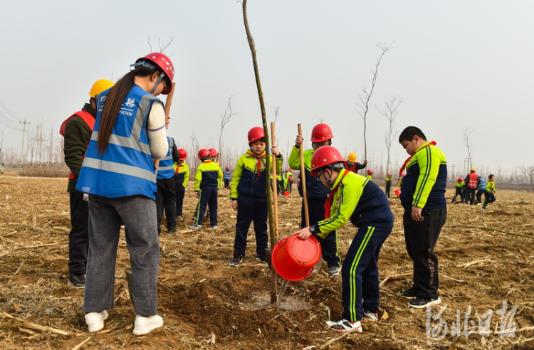 2021年3月11日,“千年秀林”管护人员与容城县贾光乡东张楚小学的学生们一起种下“雄安树”。