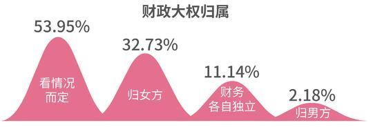 一直以来,按照 “男主外女主内”的说法,财政大权似乎理应由女方负责,但事实是这样吗?珍爱网调研发现,对于婚后财政大权归属,53.95%的单身男女认为应该看情况而定, 11.14%单身男女支持财务各自独立,也有2.18%单身男女支持归男方,只有32.73%的单身男女认为应该归女方。可见,婚后财政大权不再只属于女方。